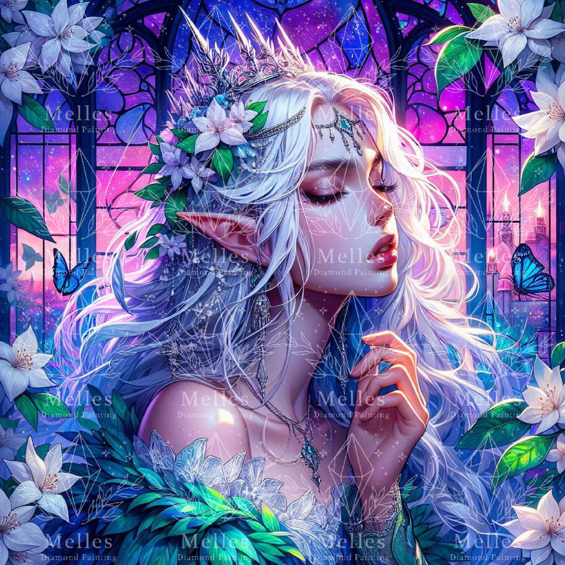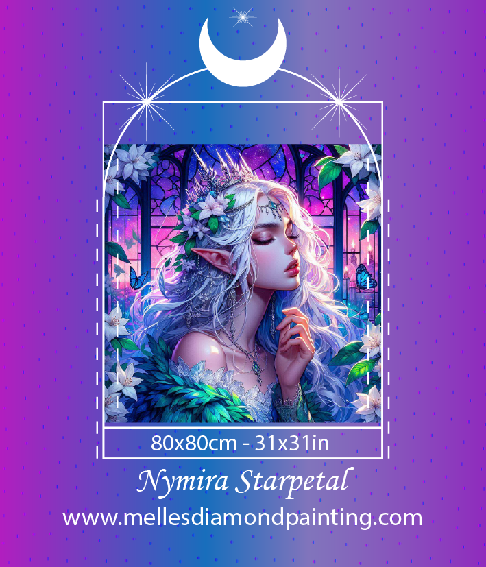天上の黄昏に照らされたニミラ・スターペタルは、月明かりに照らされた花々の幽玄な守護者として君臨する。銀髪は星の光のように魔法の庭園を流れ、冠は永遠の柔らかな輝きを放つ。蝶や花々は、彼女の魂の静寂に惹かれ、優雅に舞い降りる。