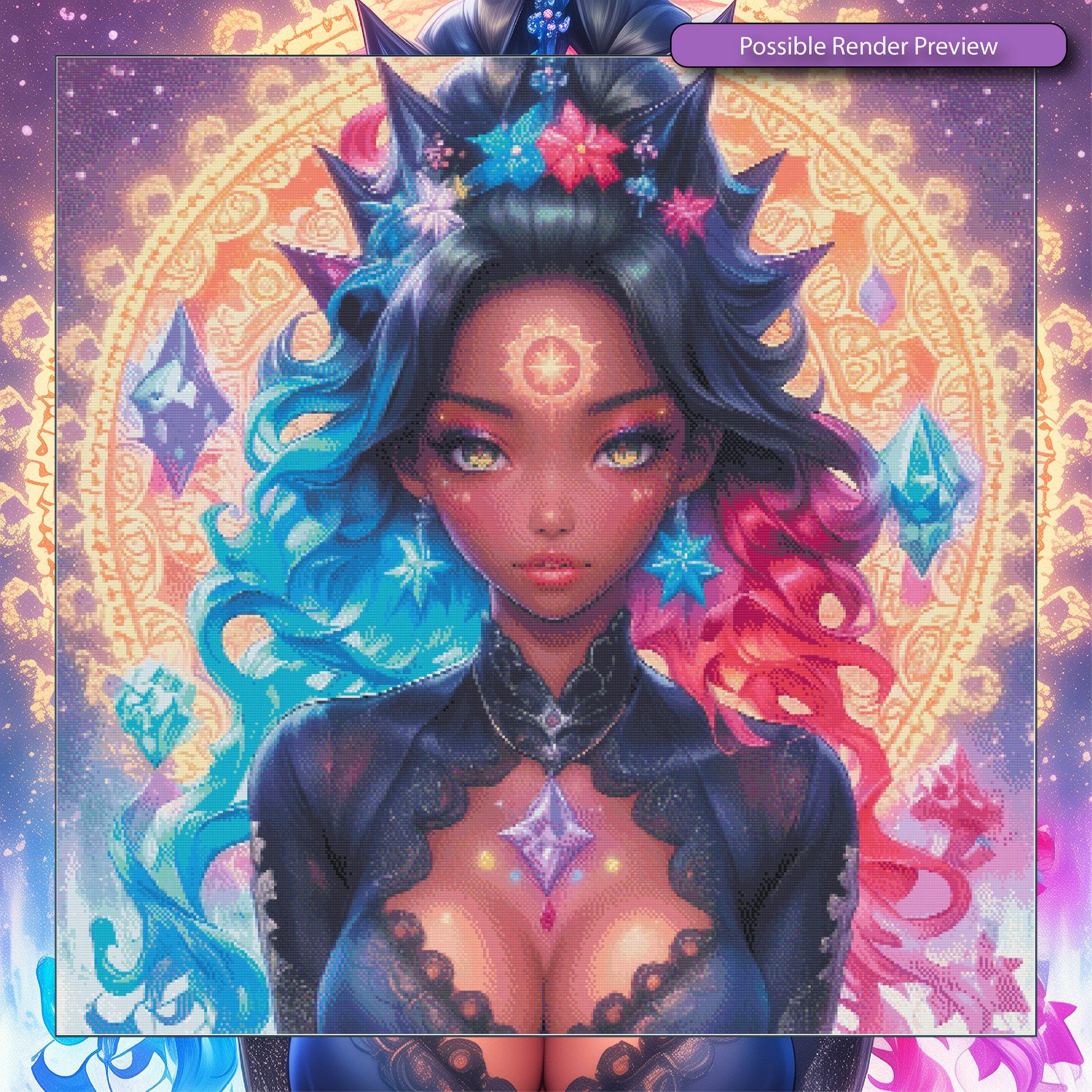Jewels shaped like stars and crystals float around her, responding to the pulse of her celestial energy.