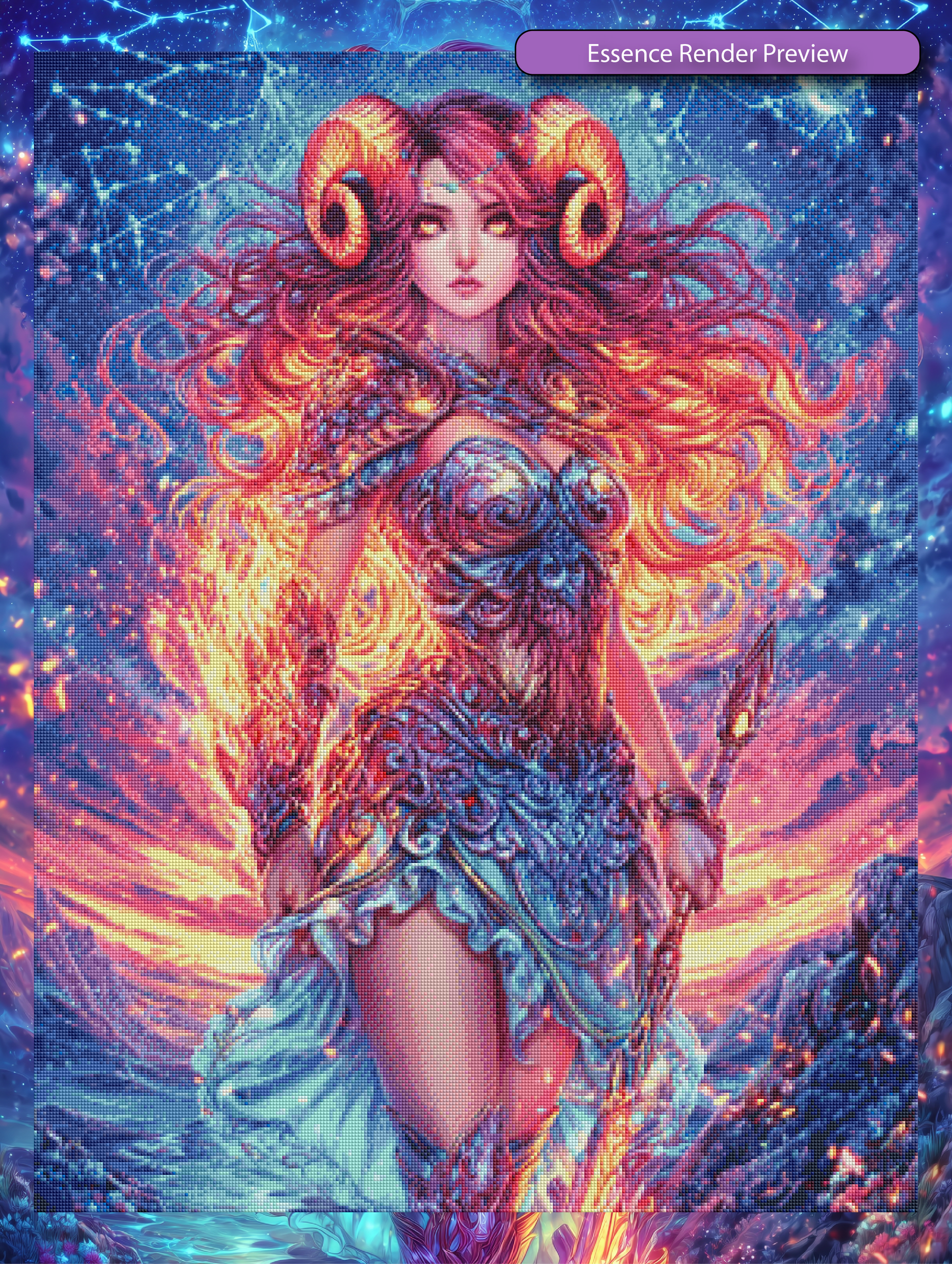 Blazing with celestial fire, Aries rises as the fierce warrior of the stars. Her flame-kissed hair flows like a solar storm, crowned by glowing ram horns that pulse with power. Clad in radiant armor, forged in the heart of constellations, she stands bold and unshaken — a symbol of courage, passion, and unstoppable will.