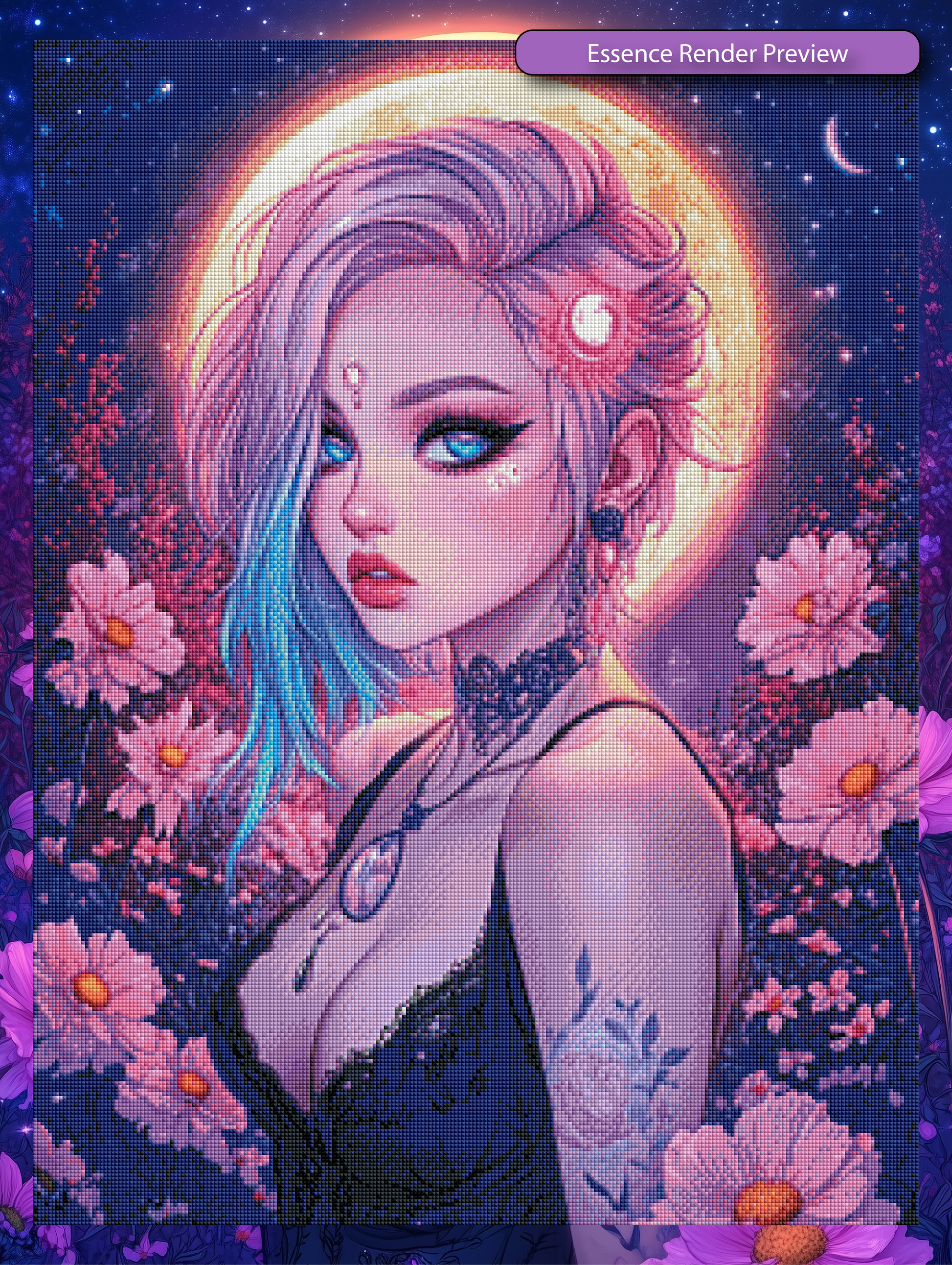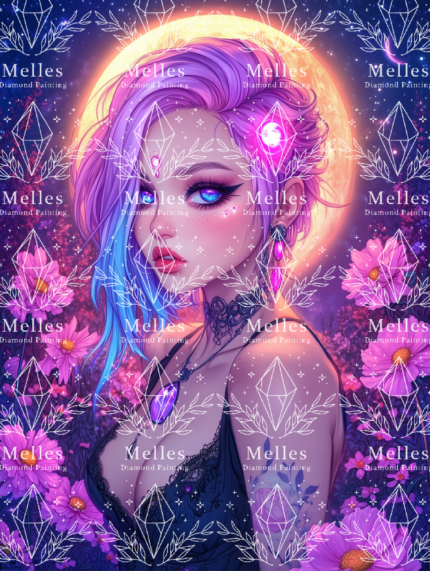 Bold as moonlight and fierce as stardust, Artemis stands cloaked in cosmic elegance. Her gaze, radiant with lavender fire, dares the stars themselves to blink. Adorned in obsidian lace and glowing amethyst, she is a siren of the lunar wild — a guardian of silence, shadow, and the sacred night.