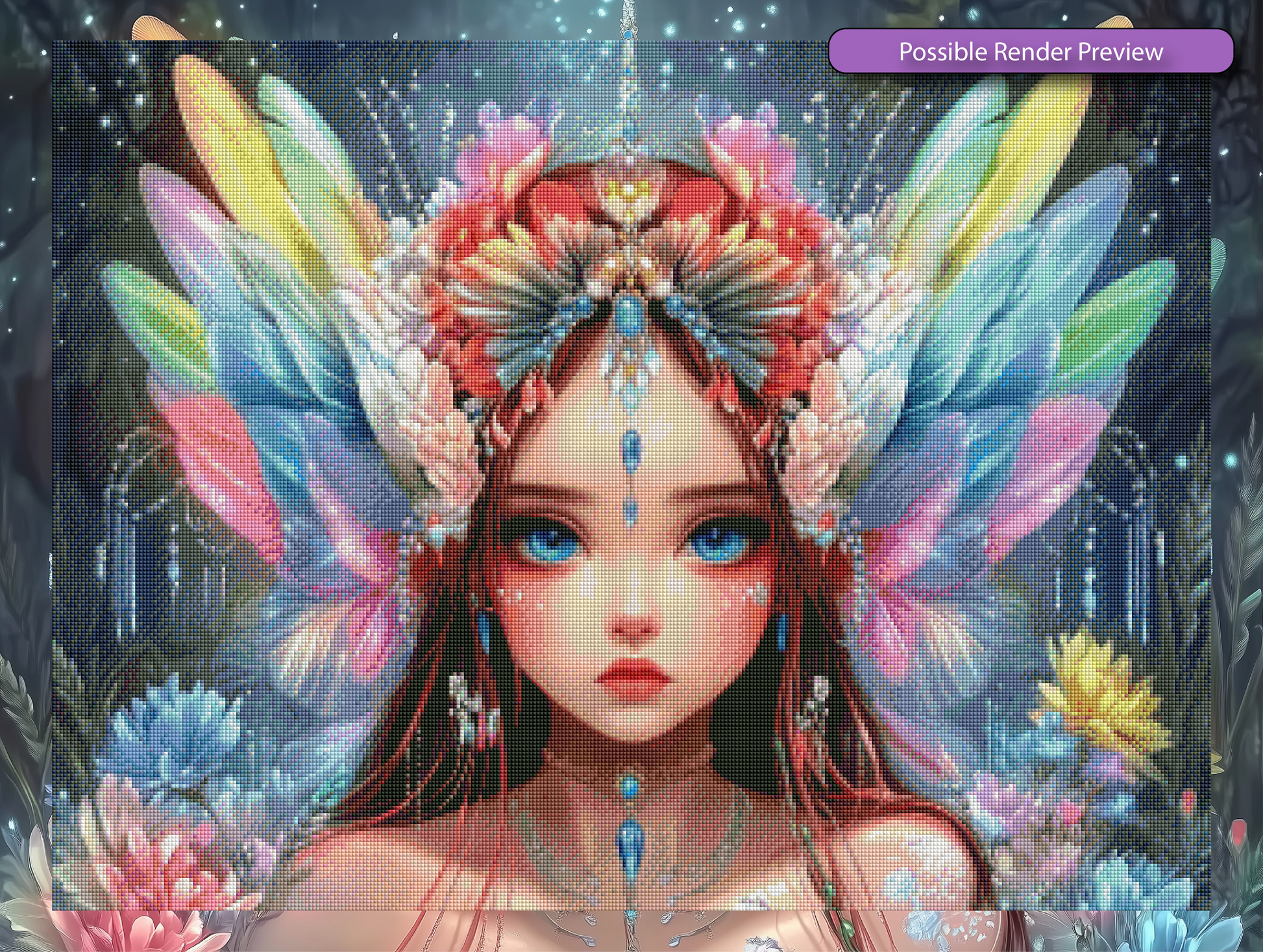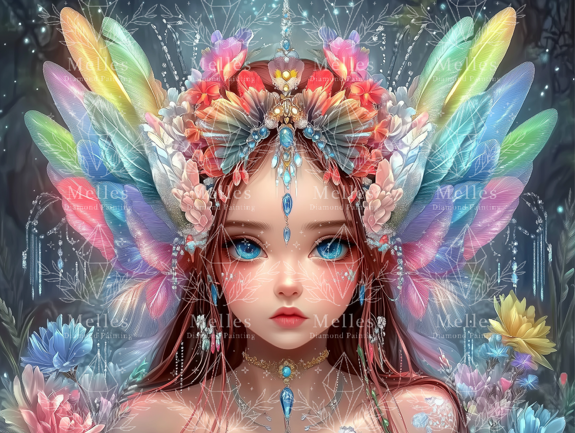 Crowned in a symphony of petals and shimmering feathers, she carries the light of a thousand dawns in her gaze. Each jewel and hue tells the story of a dream yet to take flight.