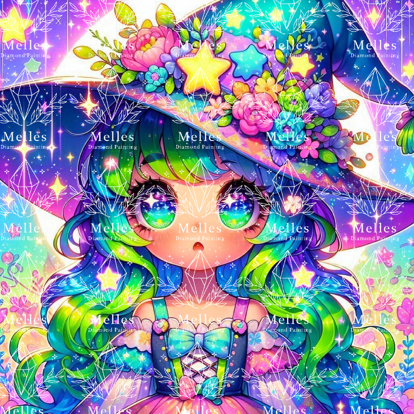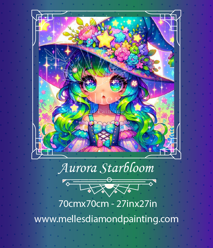 A burst of celestial magic and vibrant dreams, Aurora Starbloom is a guardian of the whimsical and the wondrous. Her kaleidoscopic eyes, shimmering with galaxies, reflect the infinite beauty of the cosmos. With hair flowing in a mesmerizing aurora of blues, greens, and purples, she embodies the magic of the night sky. Her enchanted witch’s hat, adorned with glowing stars and blooming flowers, radiates an ethereal glow, filling the air with cosmic stardust.