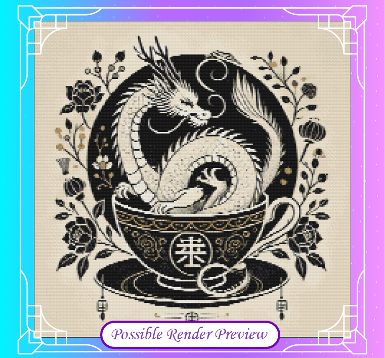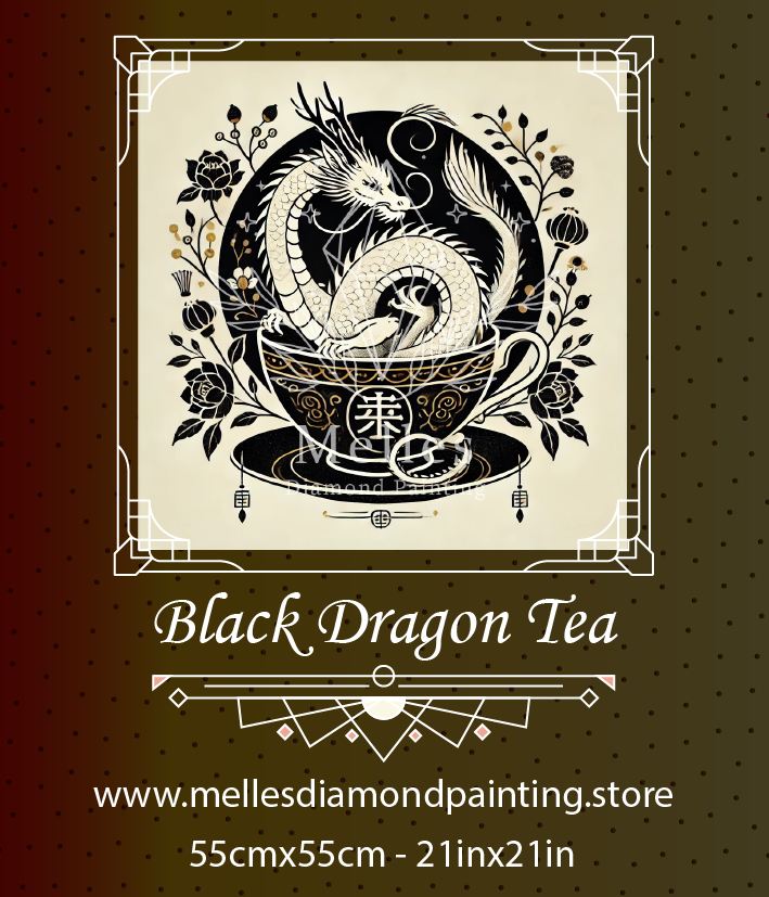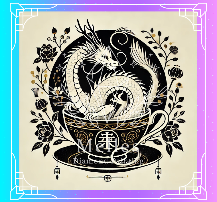 Dive into the mystique of the Black Dragon Tea design, where elegance meets enigma. A regal black-and-white dragon coils protectively within a luxurious teacup, detailed with intricate golden accents and surrounded by blooming florals. 🌹✨