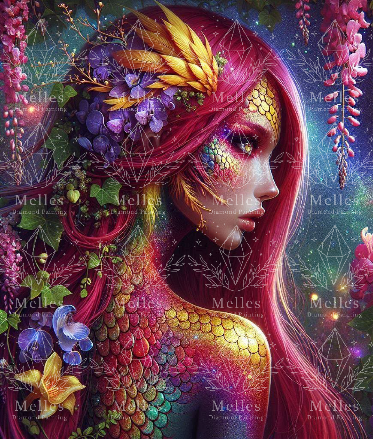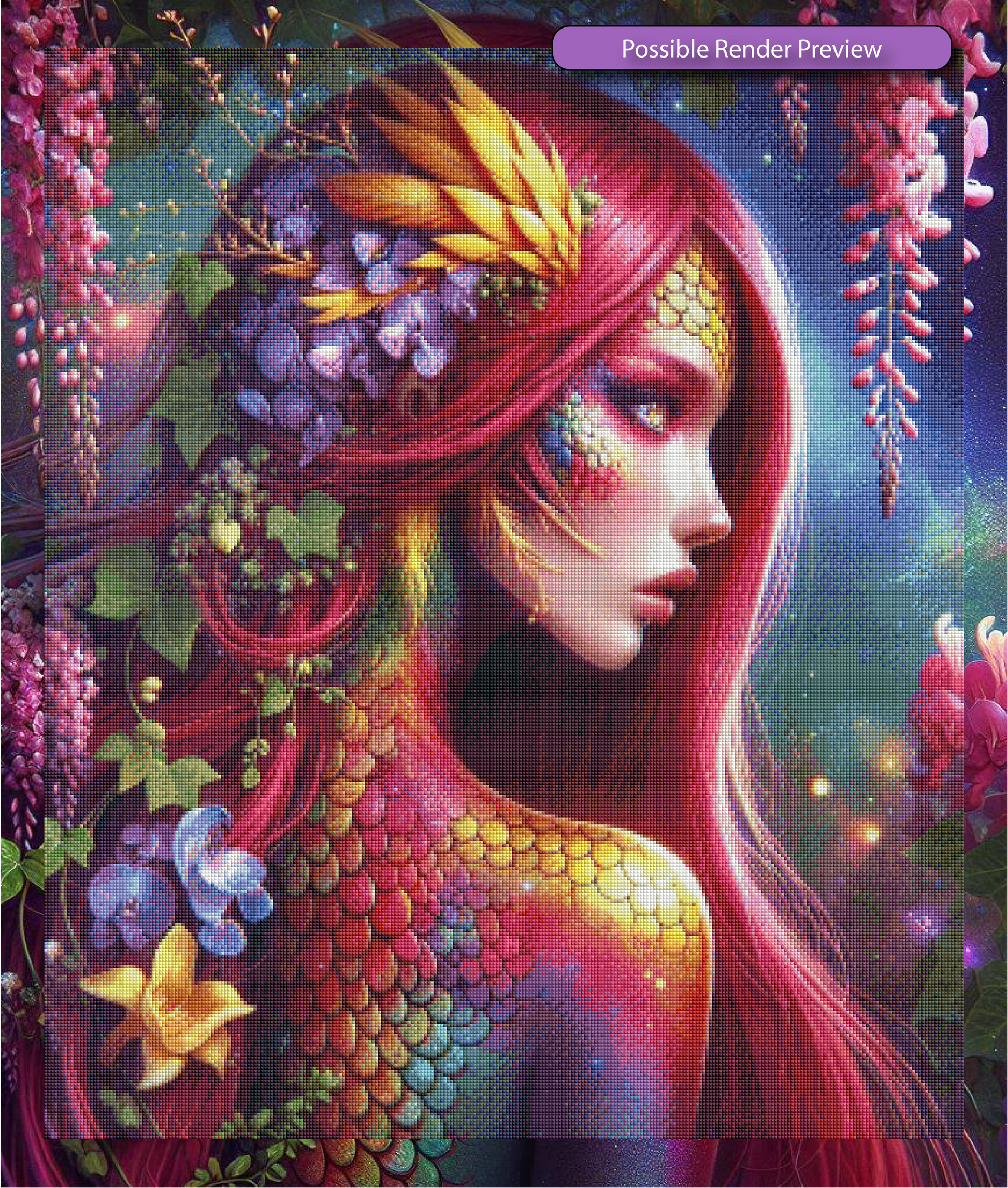 A celestial enchantress born of stardust and soil, she wears the galaxy on her skin and the blossoms of Earth in her hair. Scales shimmer like constellations across her radiant form, blooming with the colors of creation. She is the bridge between nature and the universe—a wild spirit forever blooming in cosmic light. 🌌🌿🌸