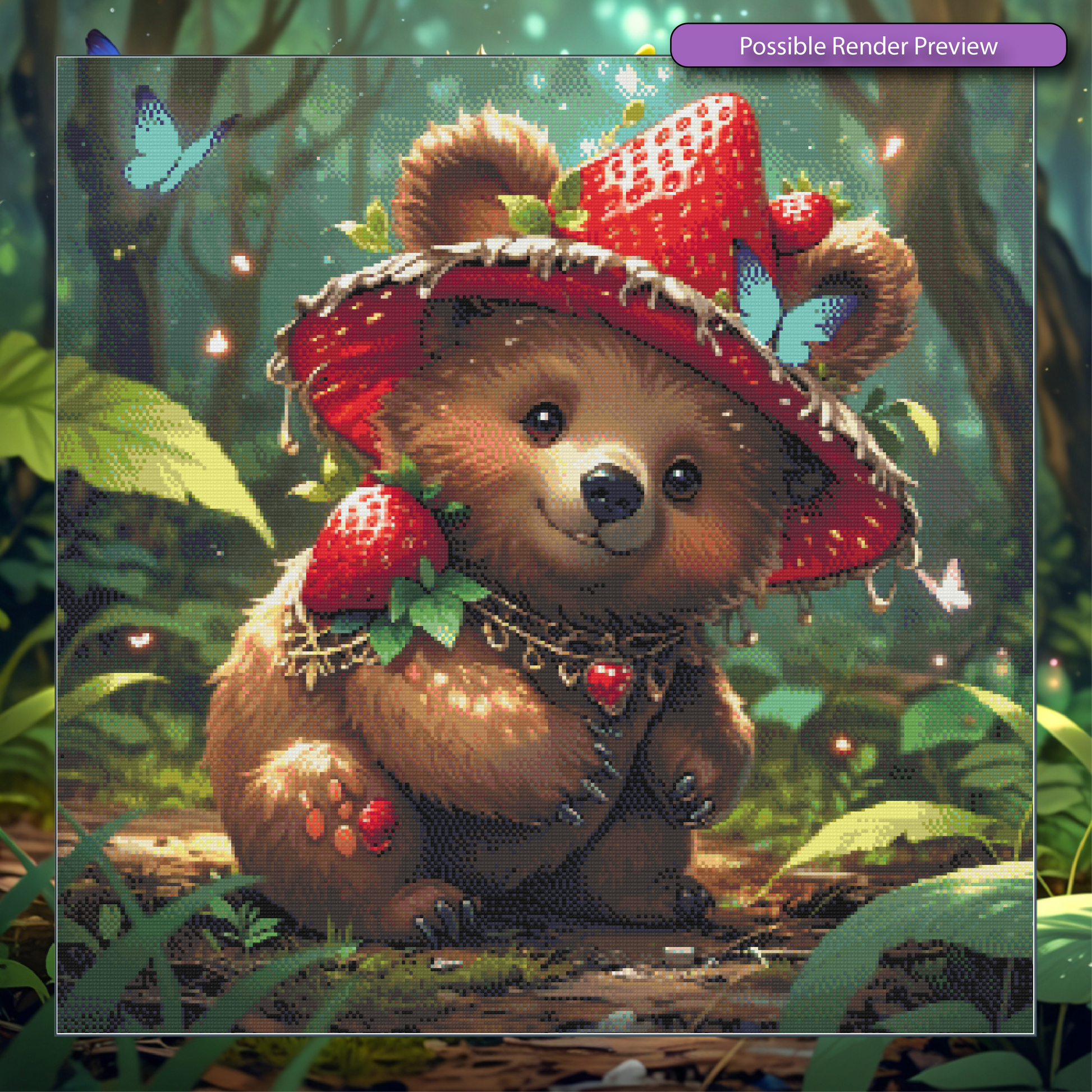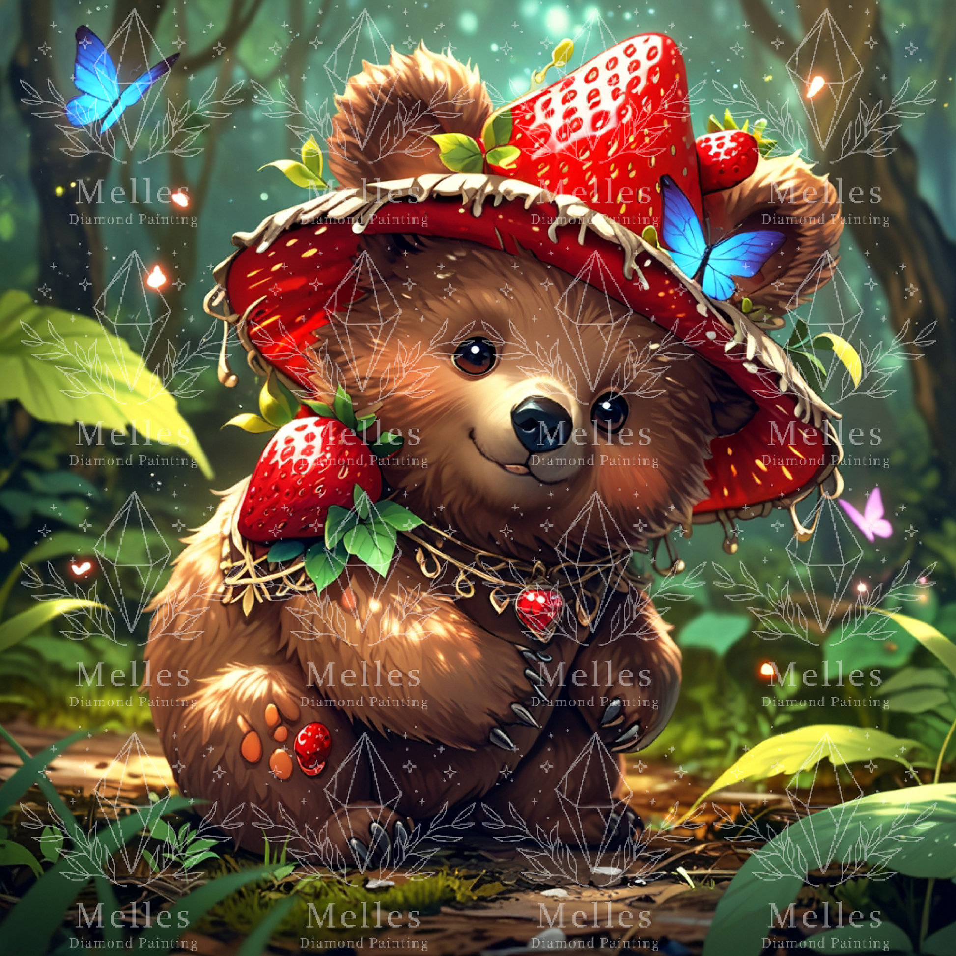 An adorable little bear with a strawberry hat, adorned with fruity jewels and surrounded by butterflies, bringing sweetness and magic to the forest.