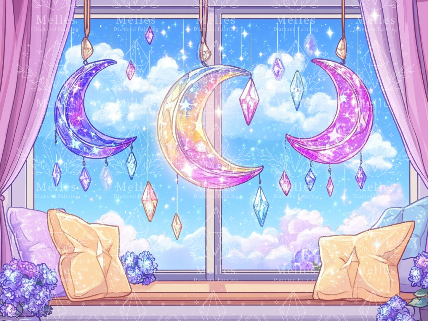 A whimsical window into the clouds, where sparkling crescent moons and shimmering crystals dance in the morning light. Lavender curtains frame the dreamscape, cozy pillows invite rest, and the sky glows with gentle magic. It’s a place where fantasies float freely and time melts into stardust. ☁️✨💫