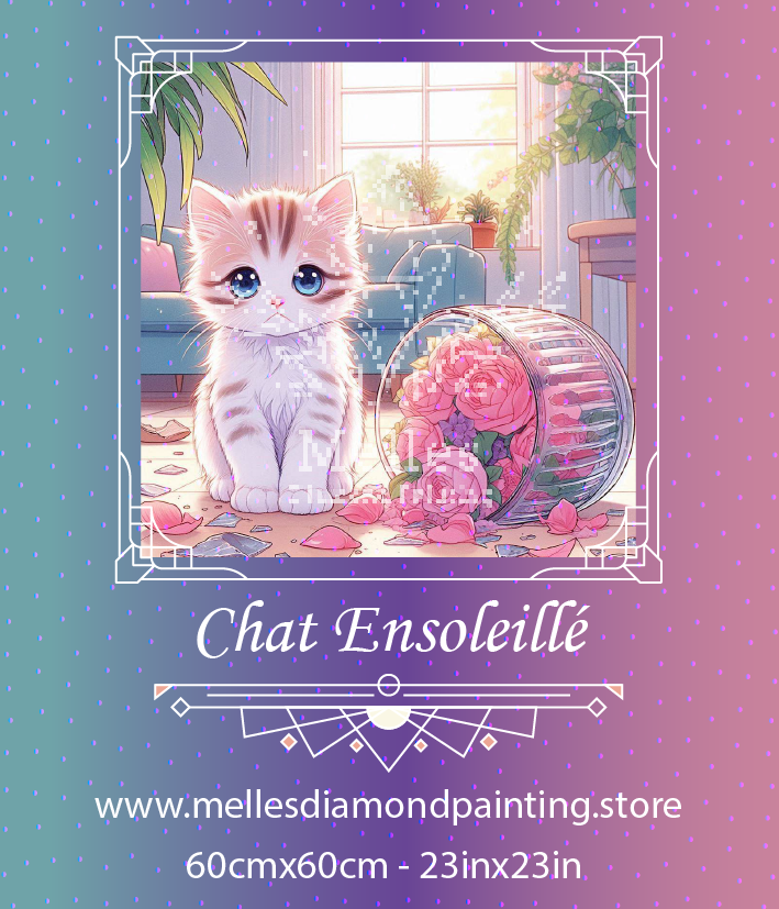 Bring a touch of charm and warmth into your space with Chat Ensoleillé, a delightful artwork that captures an adorable kitten in a sunlit room. With its big, soulful eyes and fluffy fur, this little mischief-maker sits innocently next to a toppled vase of pink roses 🌹, surrounded by scattered petals and shimmering light.