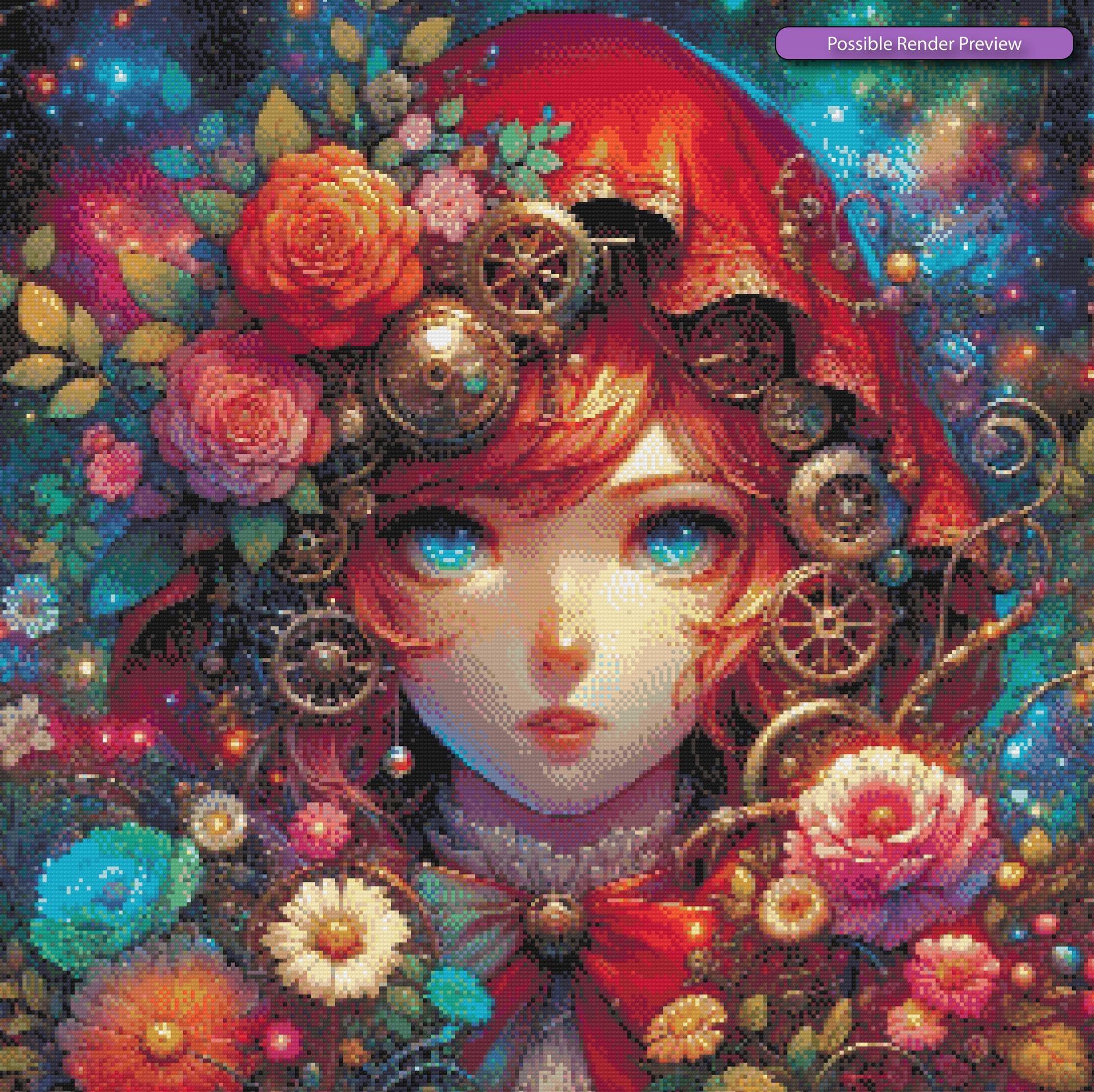 This breathtaking fusion of steampunk aesthetics and fairytale charm brings a unique interpretation of Little Red Riding Hood with a mechanical, celestial twist.