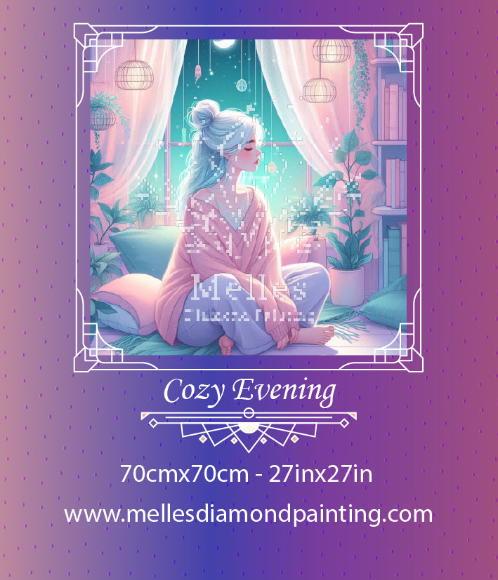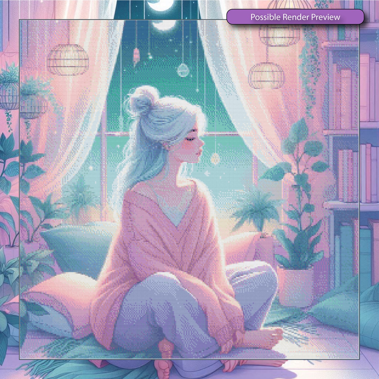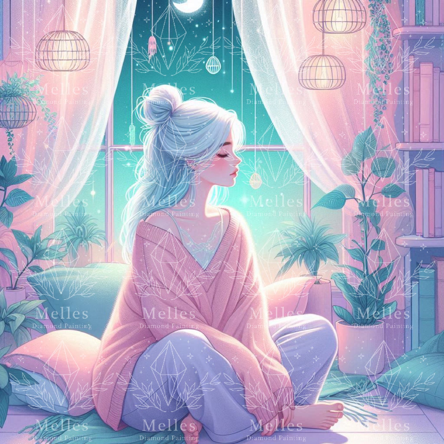 Wrapped in warmth and pastel hush, she sits beneath the moon’s tender glow. Surrounded by books, plants, and dreamy light, the night becomes a sanctuary—soft, sacred, still. Her thoughts drift like stardust in the lull of twilight.
