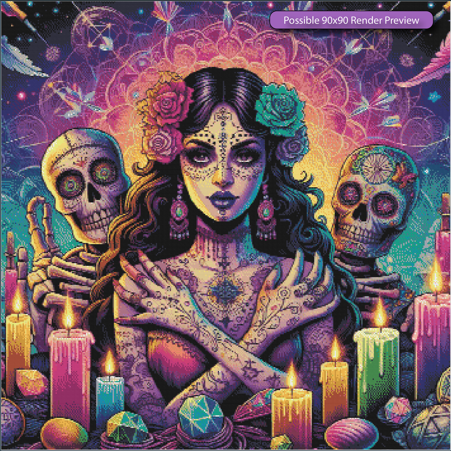 Unveil a world where the eerie is enchanting with this diamond painting kit. It’s a canvas where every jewel adds to a tale of mystery and allure. The central figure, a secret keeper of stories, is framed by vibrant colors and intricate designs. Skulls, not grim but beautifully adorned, remind us of life’s vibrant cycle.