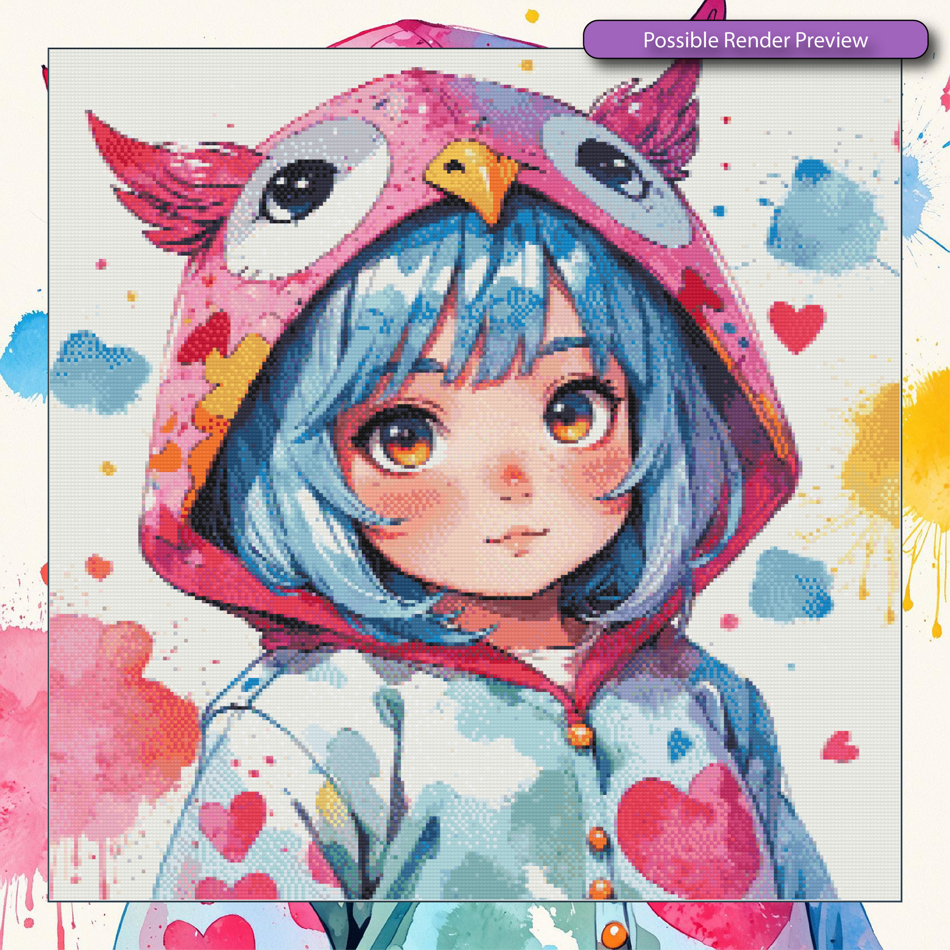 “A mischievous little girl with sparkling eyes, dressed in a colorful owl hoodie, surrounded by splashes of paint and joyful hearts.