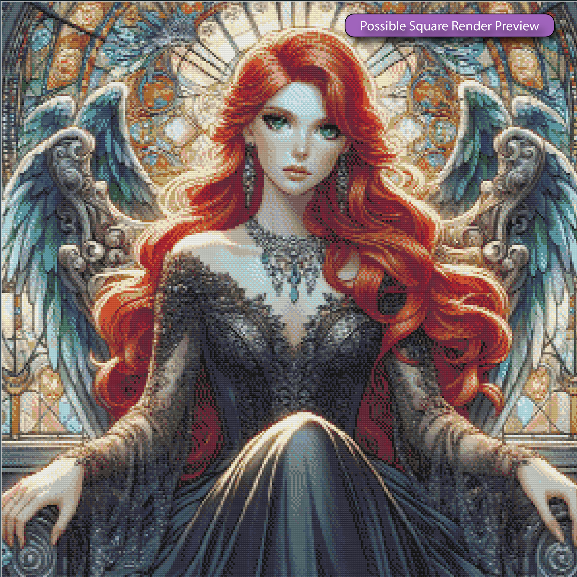In a majestic setting adorned with intricate stained glass, a regal woman sits on an ornate throne. Her fiery red hair cascades in waves, contrasting beautifully with her mesmerizing green eyes.