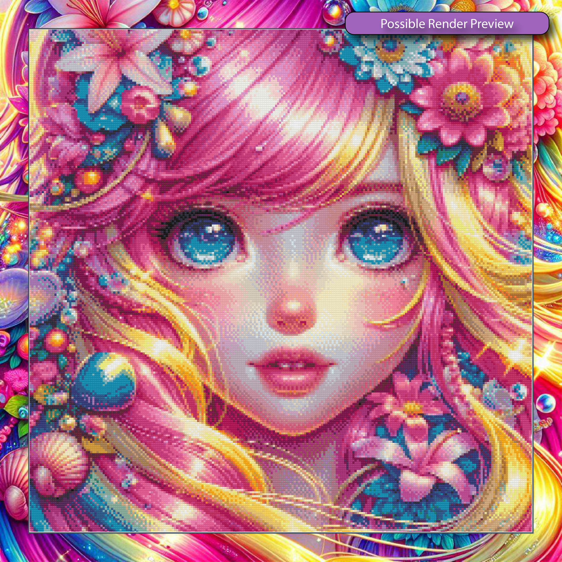 Douce Arcanelle is a radiant blossom spirit, her eyes shimmering like starlit oceans and her hair cascading in vibrant candy hues. Adorned with shells, petals, and glimmering droplets, she embodies the pure sweetness of fantasy and light. 🌺💗🌈✨