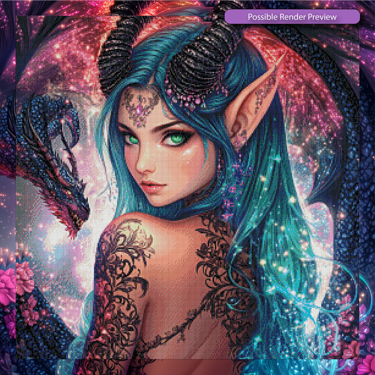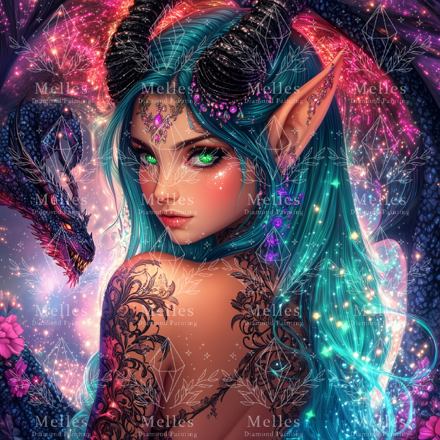 Crowned by obsidian horns and cloaked in stardust, Dracielle is the enchantress of embers and shadowflight. Her emerald gaze holds ancient secrets, while the sapphire-scaled dragon at her side pulses with cosmic fire. With inked markings that dance like flames across her skin, she is a guardian of forgotten realms and forbidden beauty. 💫🔥🖤