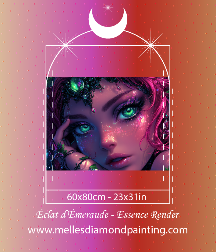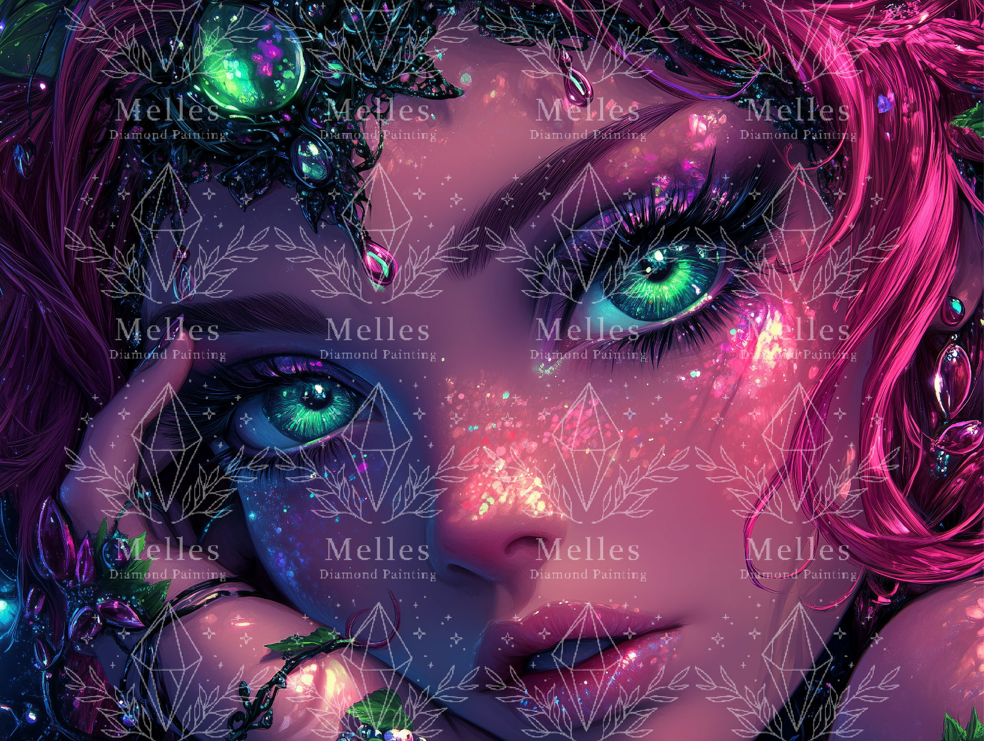Her gaze, a prism of emerald fire, pierces through shadows with the brilliance of a living jewel. Each spark upon her skin is a secret told in light and mystery.