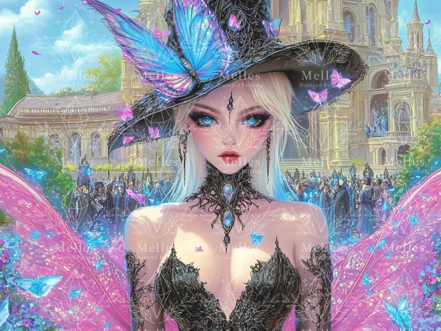 Bathed in daylight and crowned with butterflies, she stands as the sovereign of luminous grace. Her wings, spun from enchanted rose quartz and starlight, shimmer with every whisper of wind. Adorned in black lace woven from ancient spells, she holds the power of soft wonder and fierce elegance.
