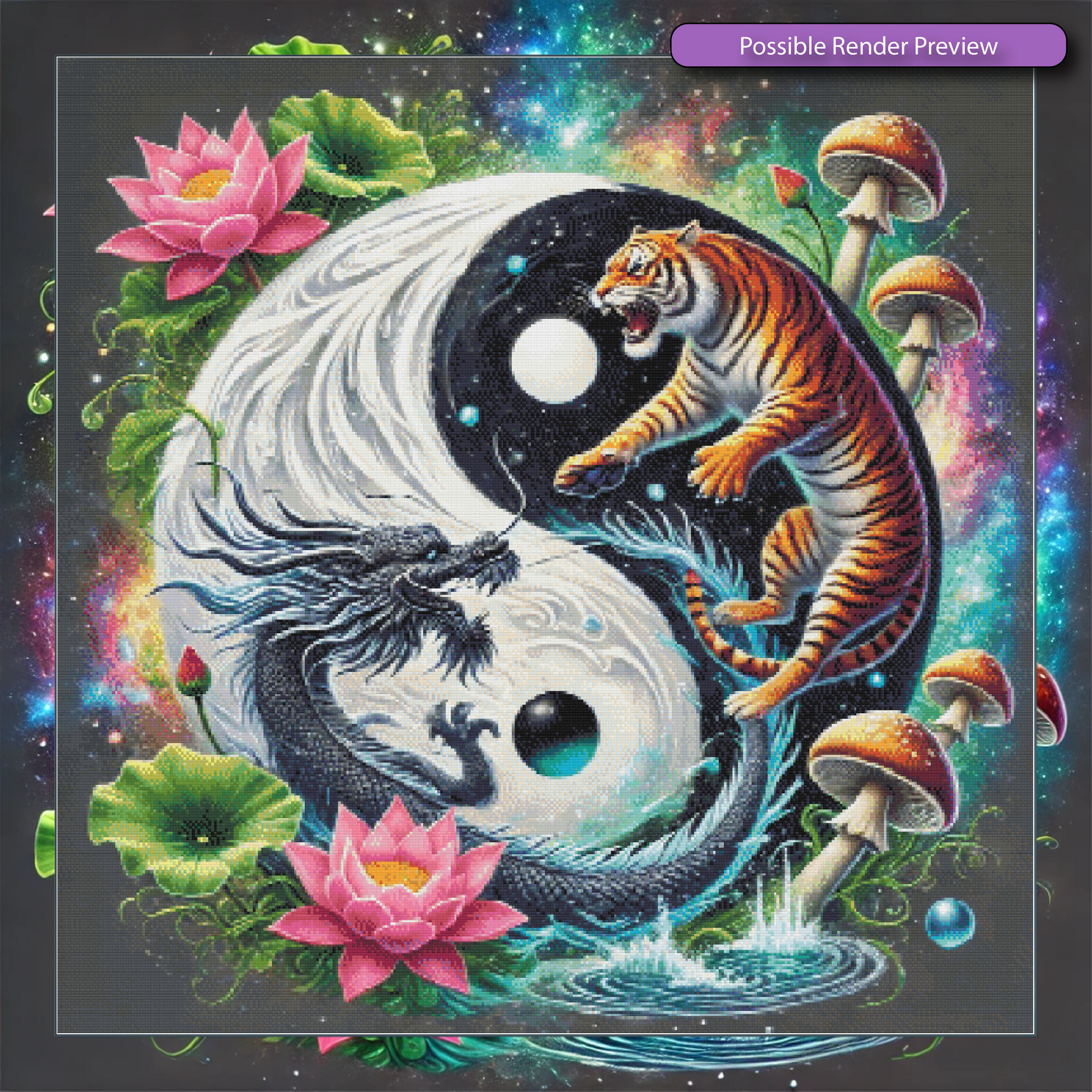 A dance of opposites, Eternal Balance captures the sacred harmony between chaos and calm. The dragon and tiger—ancient symbols of wisdom and strength—circle within the cosmic flow of Yin and Yang, guarded by lotus blooms and the pulse of creation. 🌸🌌
