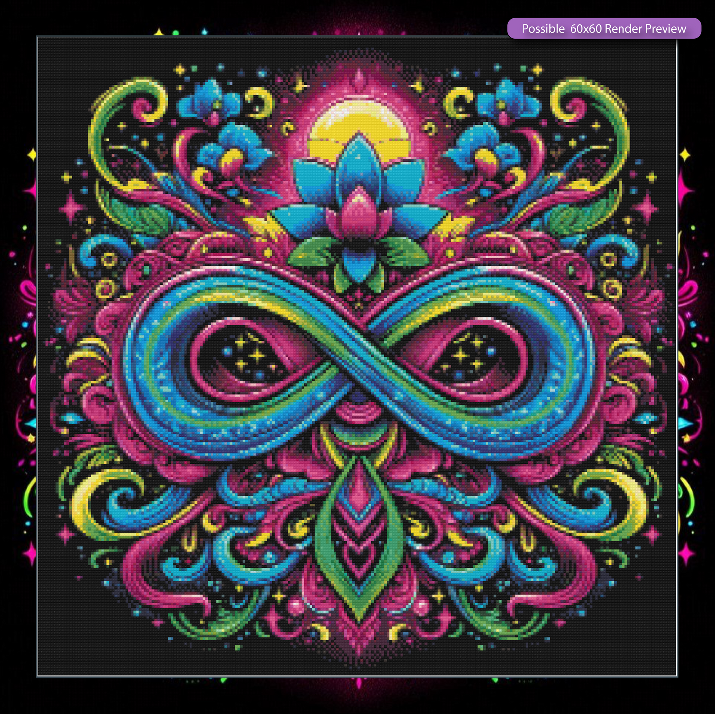 🌸 Lotus at sunrise – a symbol of renewal and inner fire ♾️ Infinity loop woven into the heart of the design 🌈 Electric neon florals pulsing with joyful symmetry
