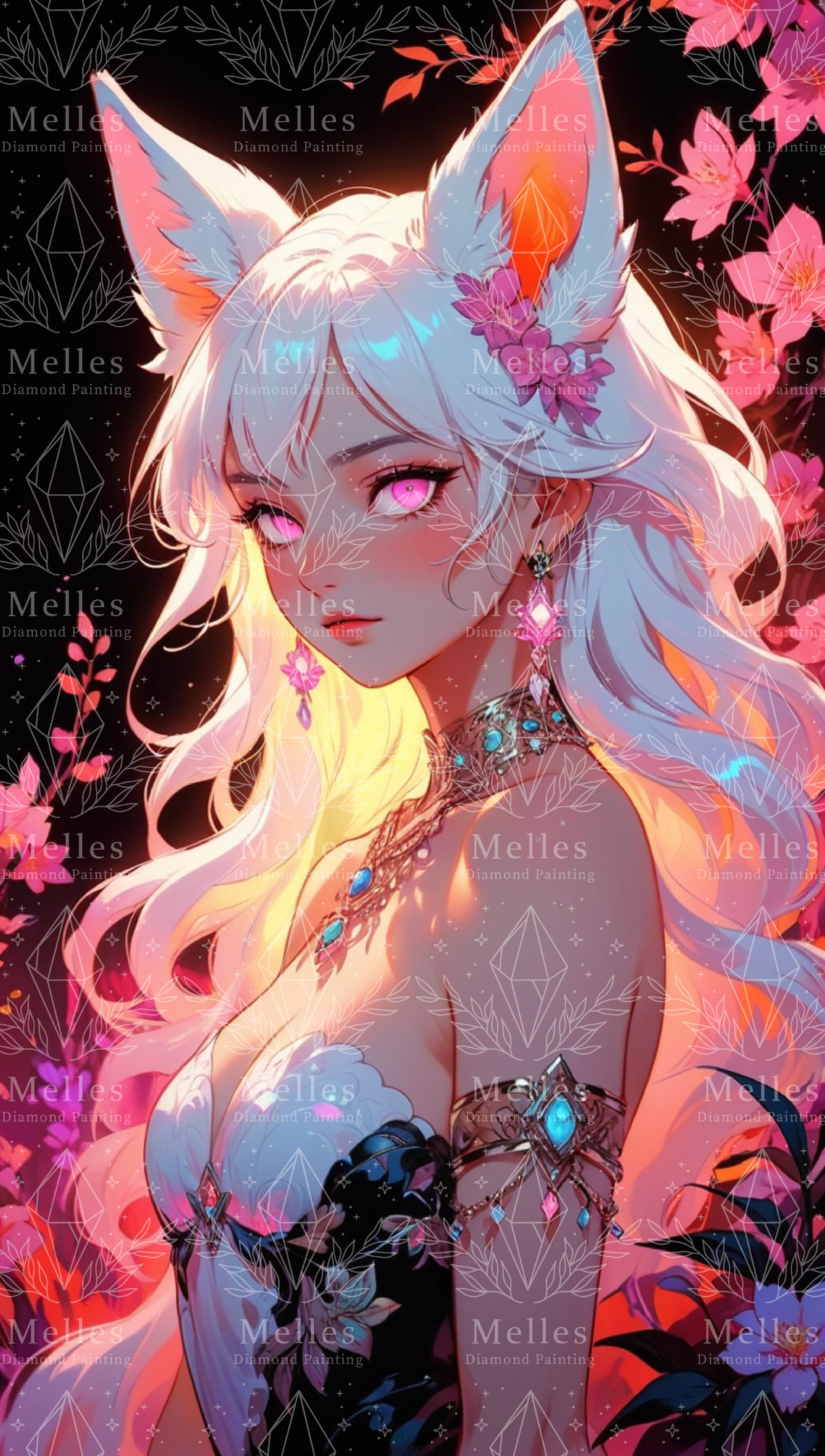 Imagine uma figura magnífica com cabelos brancos fluindo, orelhas de raposa, e olhos cor-de-rosa, emoldurados por uma aura de estilo incomparável. Esta deusa da nossa imaginação está situada num cenário de flores flamejantes, criando um fundo vibrante e repleto de vida.