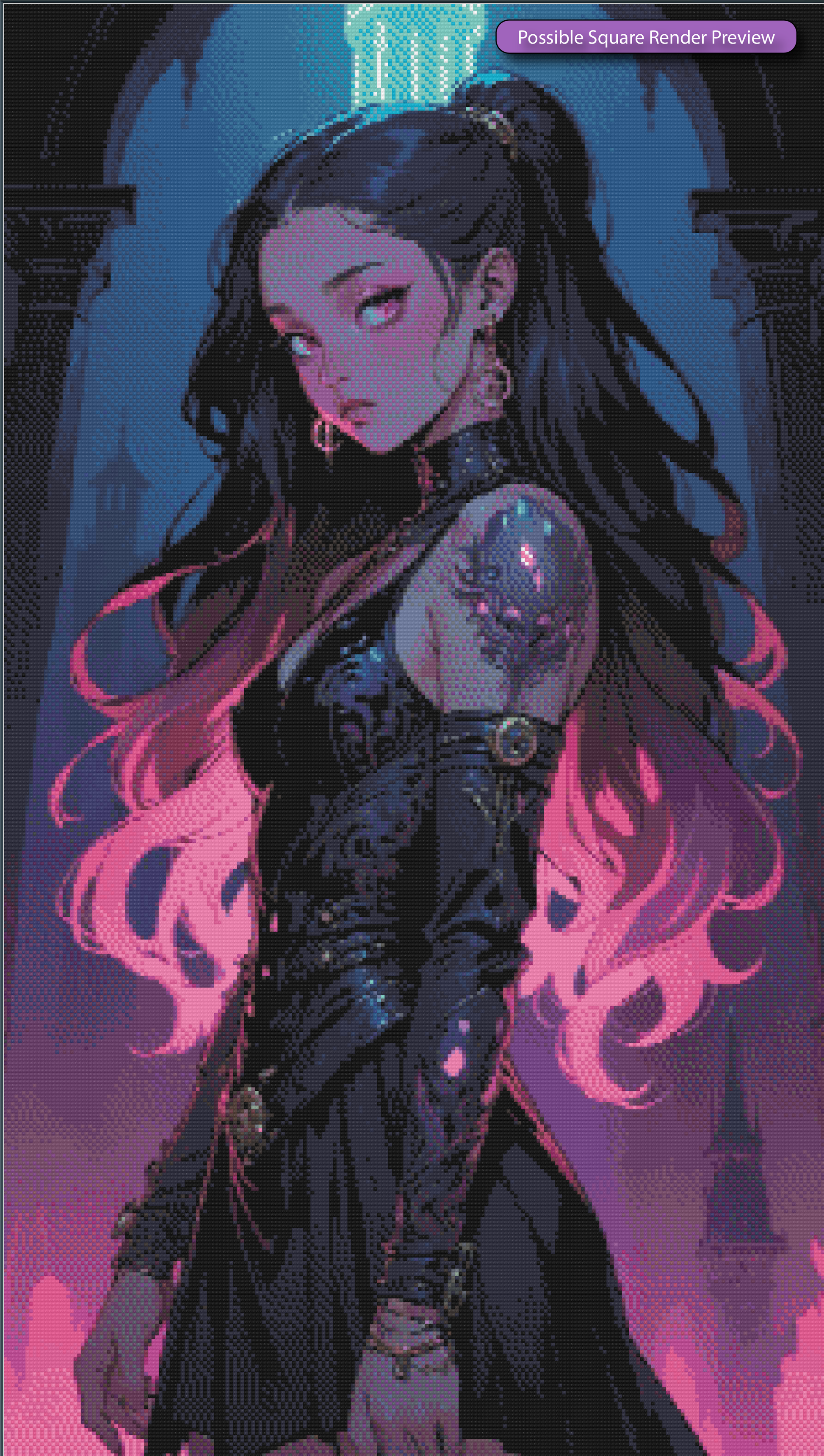 Descubra o fascínio de 'Gabriella', uma pintura de diamante que transporta você para um reino de esplendor gótico e intrigas mágicas. Esta obra cativante apresenta Gabriella, uma figura envolta em mistério, seu cabelo, tingido com tons de rosa, flui elegantemente sobre seu traje enigmático, reminiscente de antigas magias tecidas na trama da noite.