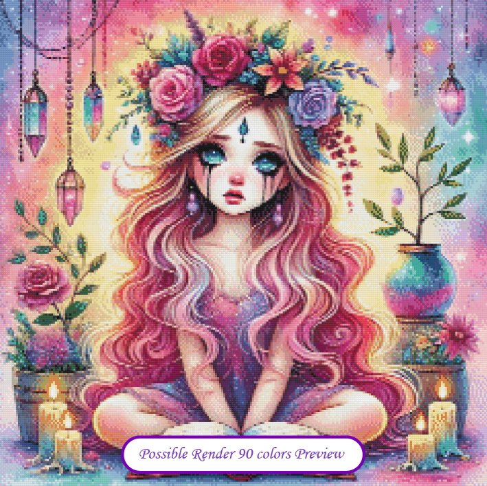 Immerse yourself in the delicate world of Heart Inside, a design bursting with emotion, beauty, and mystery. A wistful girl adorned with a crown of roses and exotic blooms sits surrounded by glowing candles, vibrant plants, and suspended crystal lanterns, each dripping with magical energy. ๐น๐ฎ