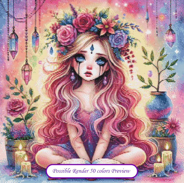 Her tear-streaked face tells a story of heartfelt longing, while the open book on her lap suggests the untold tales of a mystical journey. The hues of her cascading hair and the celestial glow of the background create an atmosphere of enchantment and wonder. ๐๐