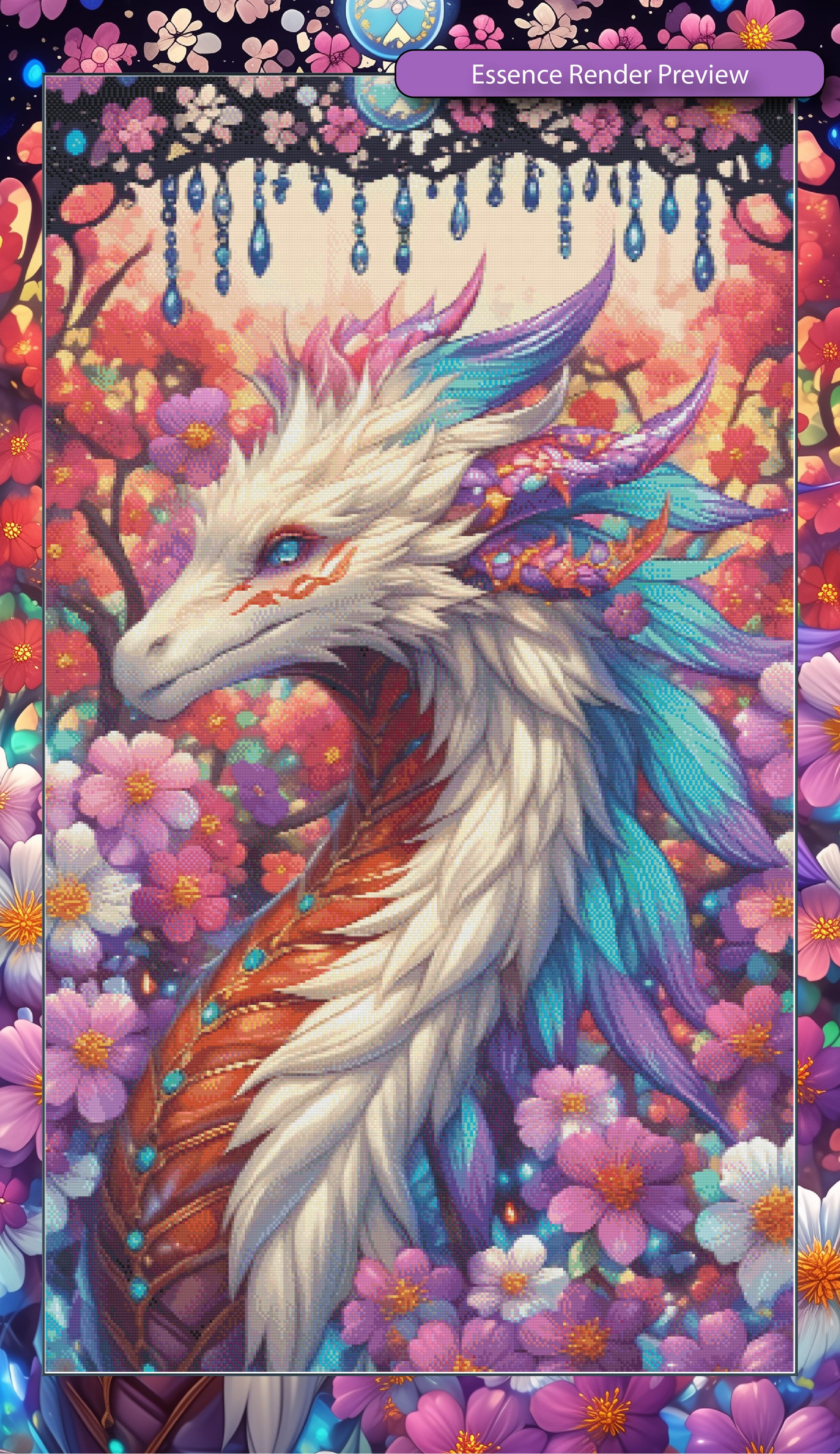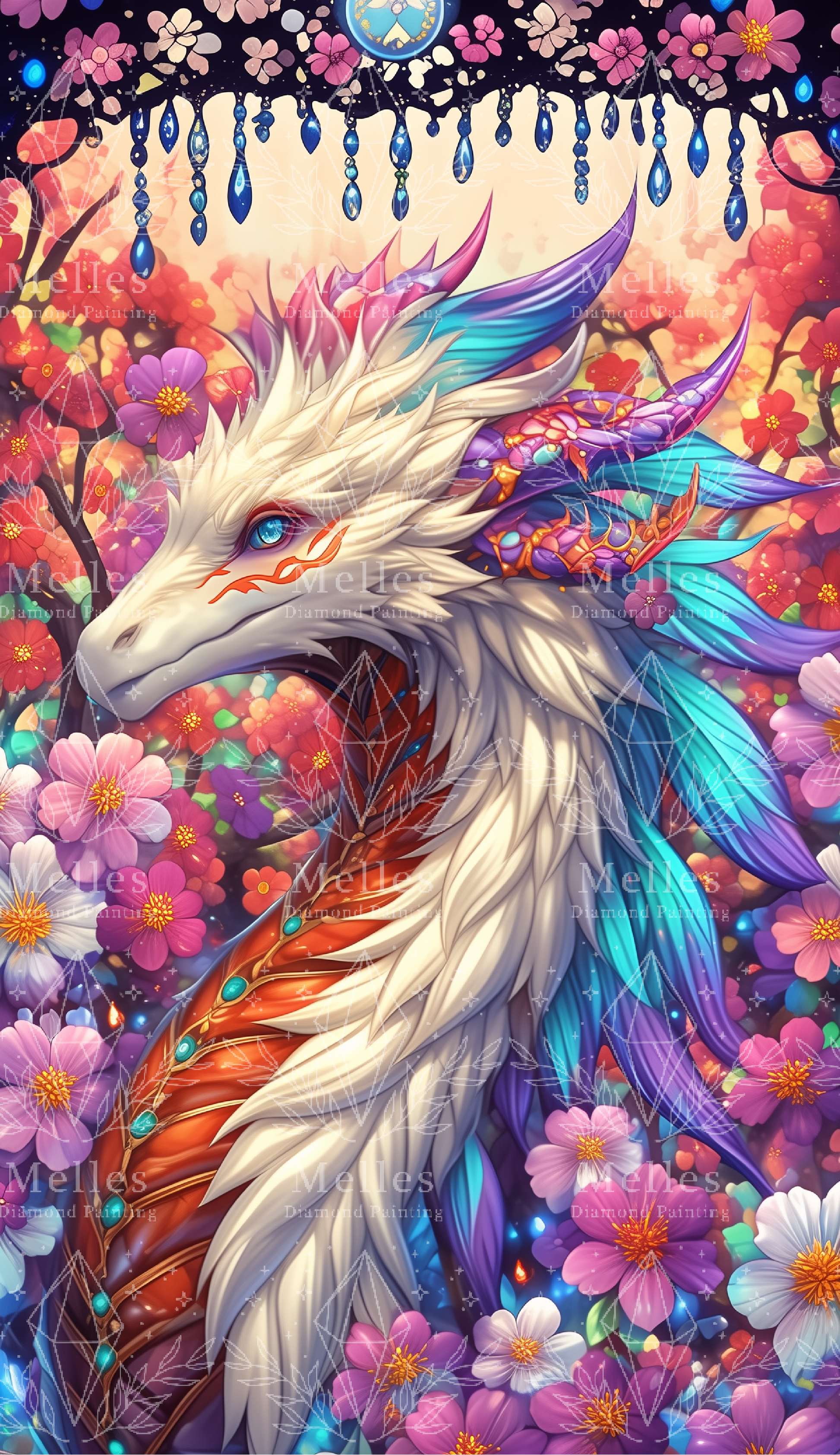 A majestic dragon adorned with iridescent scales, shimmering in hues of sapphire, violet, and emerald. Surrounded by a sea of blossoms, this guardian of nature embodies both strength and grace, with eyes glowing like precious gems and markings that burn with ancient fire.