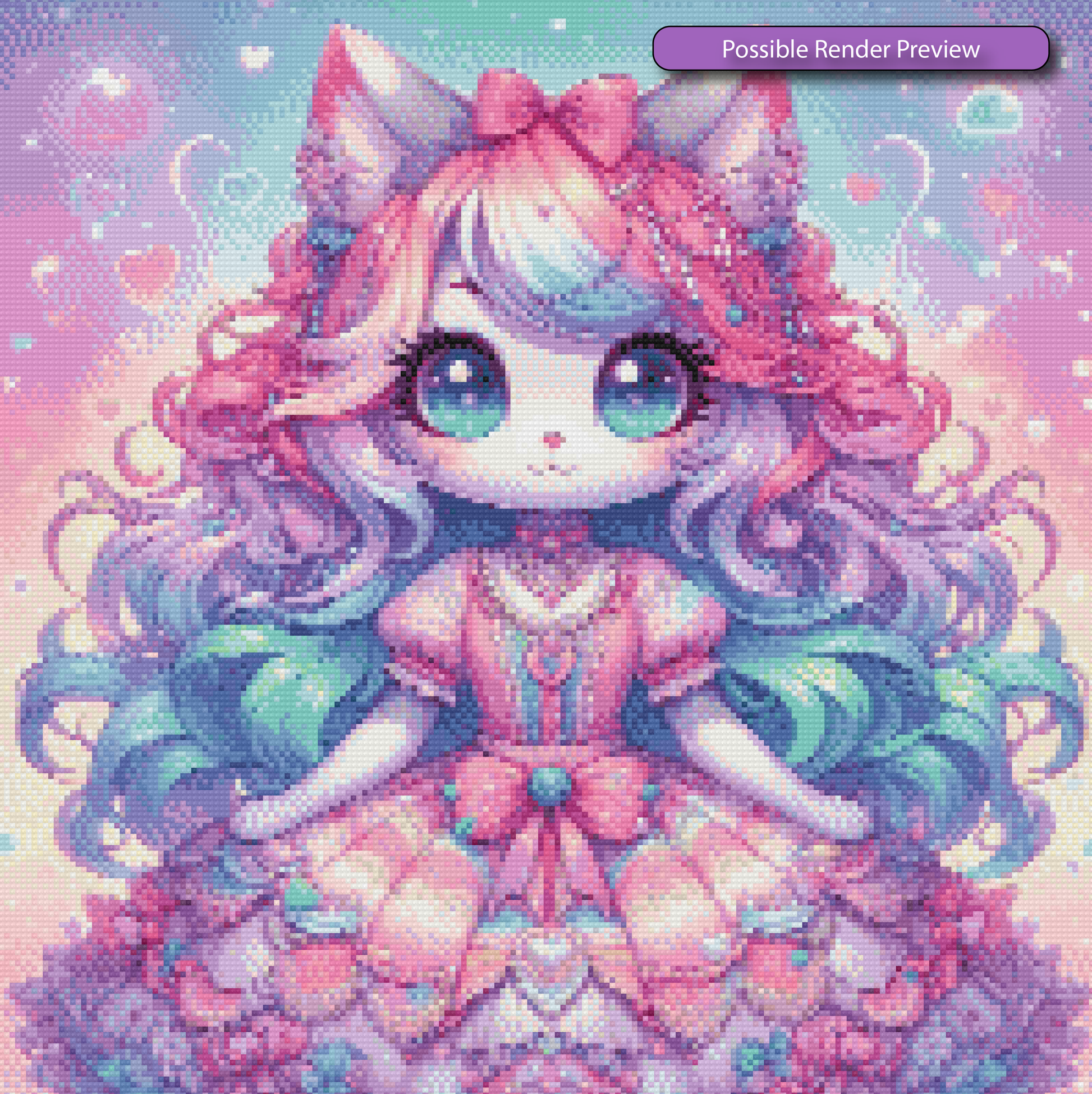 Meet Kimi, our latest adorable and colorful creation! This enchanting artwork features a cute feline character with vibrant rainbow hair, sparkling eyes, and a beautifully detailed pastel dress. With hearts and soft, dreamy colors surrounding her, Kimi is perfect for adding a sweet and whimsical touch to any space.