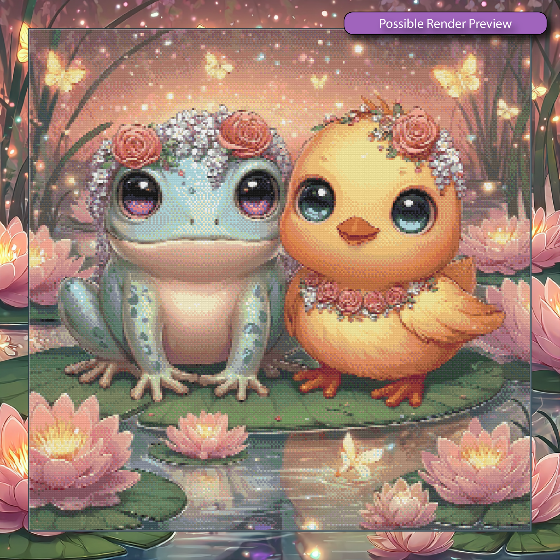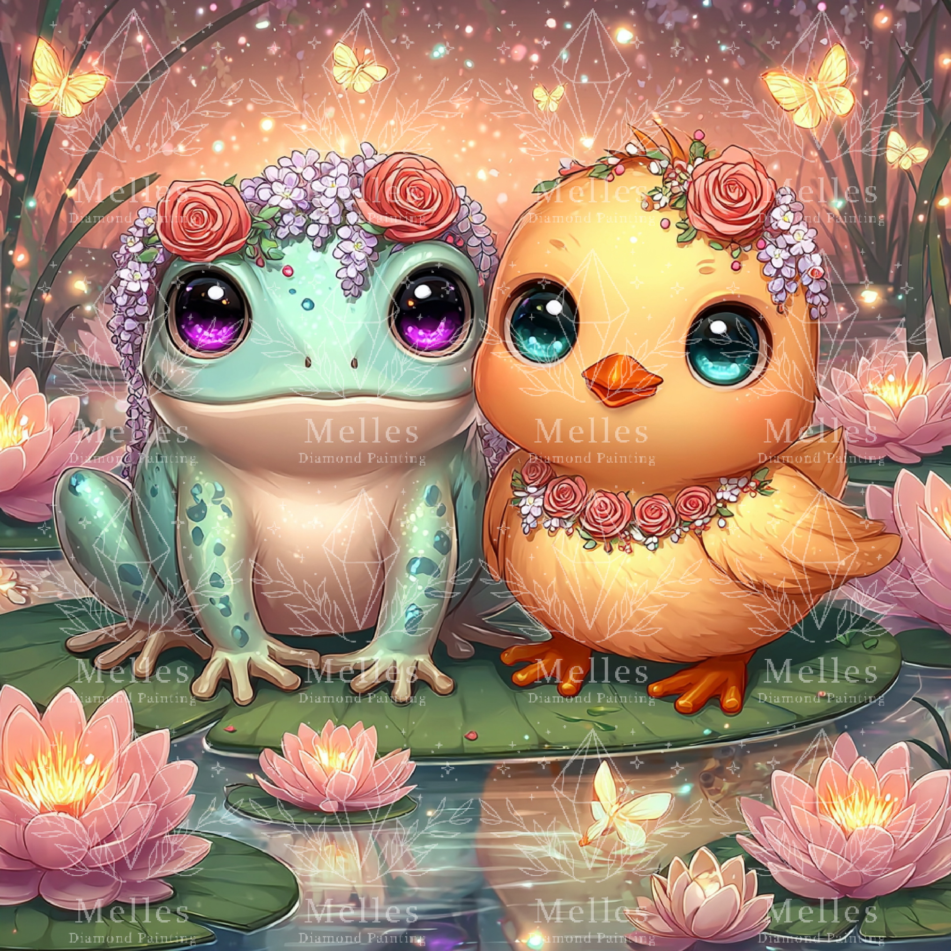 Lake Pals features an adorable frog and duckling adorned with tiny flower crowns, sitting together on lily pads under a glowing, dreamy twilight. Surrounded by soft petals and sparkling water, their friendship lights up the lake with pure joy. ๐๐๐ฟ๐ฆ๐ธ