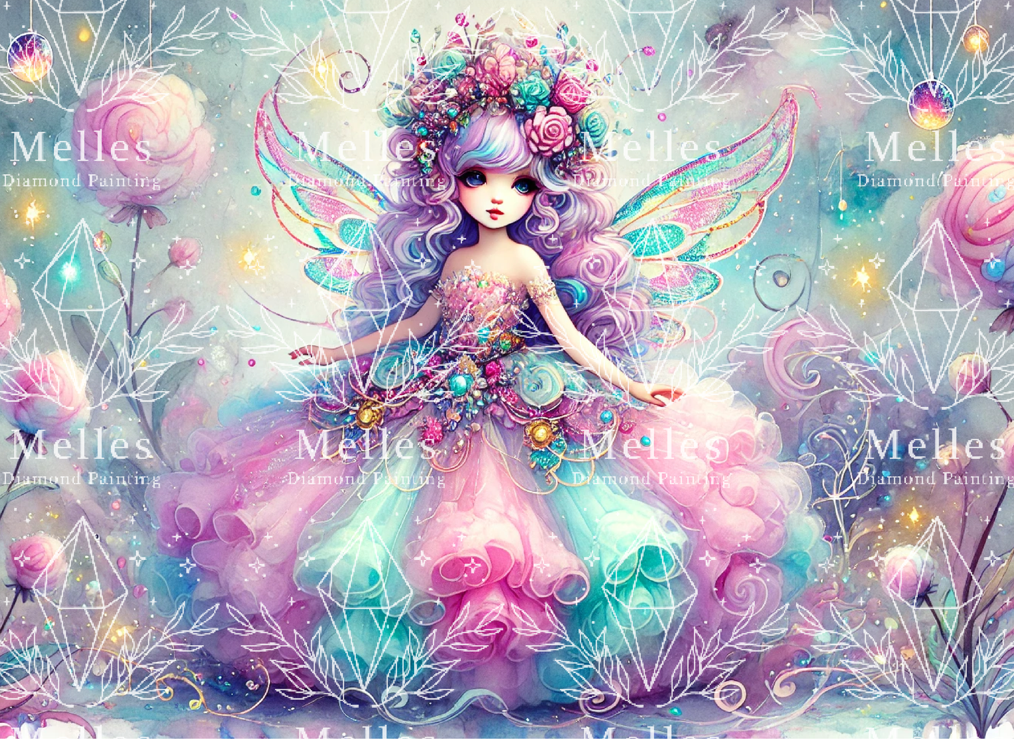 Step into a whimsical dreamland with Little Cotton, a magical artwork radiating charm and elegance. This enchanting fairy, dressed in a flowing pastel gown of soft pink and aqua hues, sparkles with intricate details of gems and delicate embellishments 🌸.