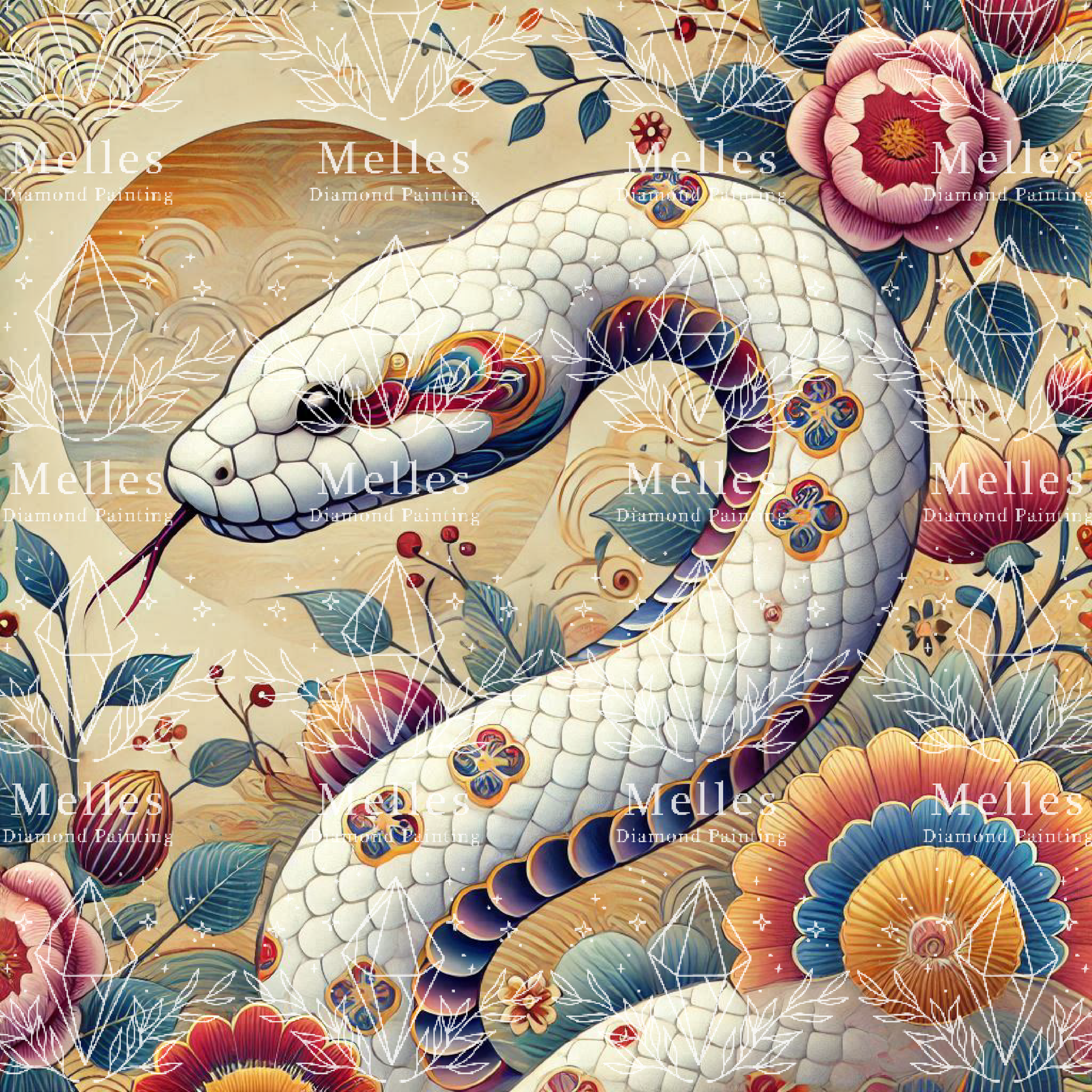 Immerse yourself in the elegance of Lunar Snake, a breathtaking diamond painting design inspired by nature and mythology. This radiant serpent, with its pearlescent scales adorned with intricate, colorful patterns 🌺, winds gracefully through a vibrant landscape of blossoms and leaves.