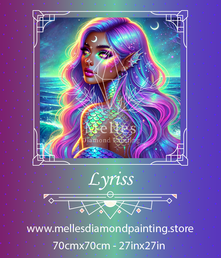 Immerse yourself in the magical underwater world with Lyriss, a stunning diamond painting design. Featuring a mystical mermaid with shimmering pastel hair flowing like ocean waves, her scales glisten in radiant hues of turquoise, lavender, and gold. Her captivating gaze, framed by glowing eyes and glittering makeup, reflects the beauty of the moonlit sea ๐โจ.