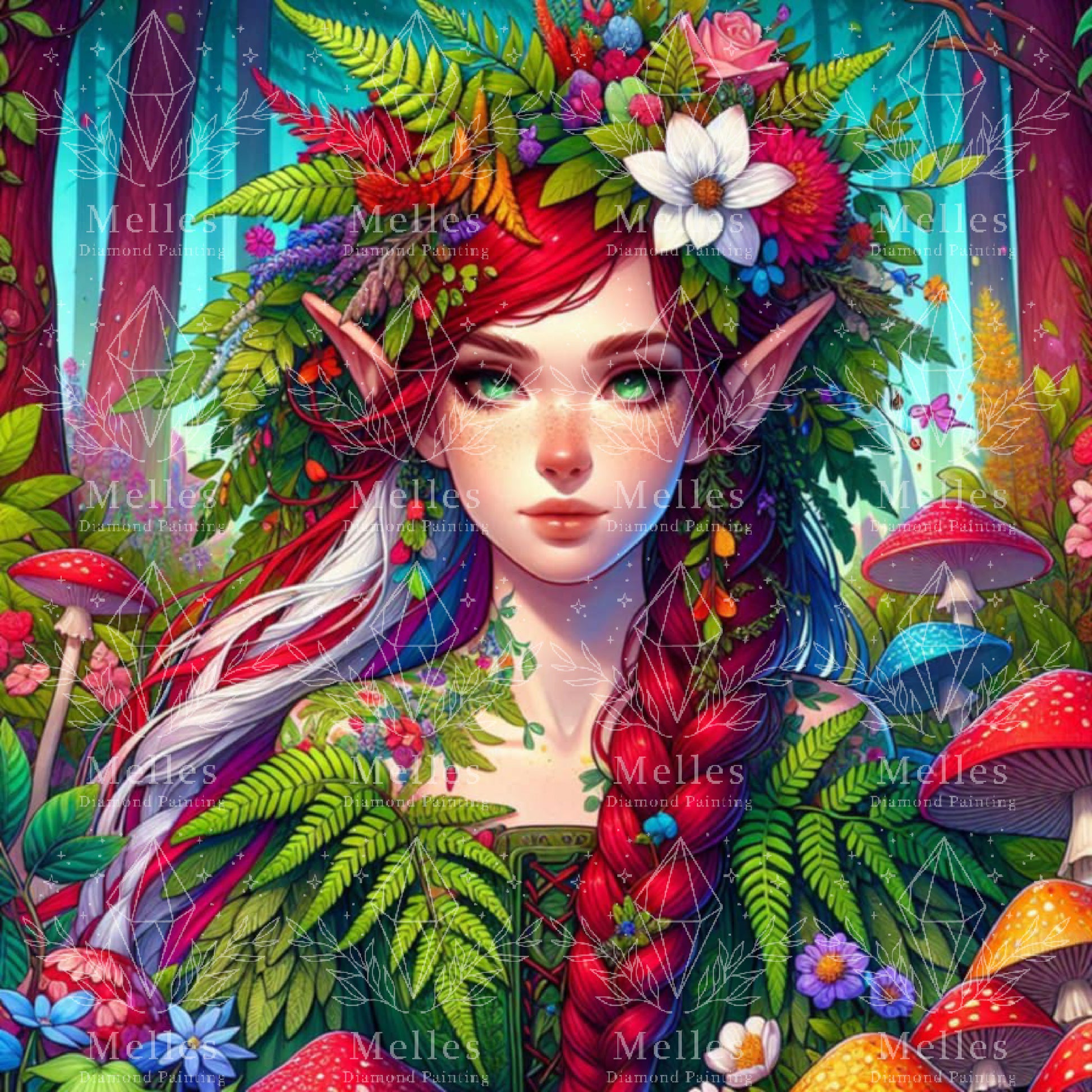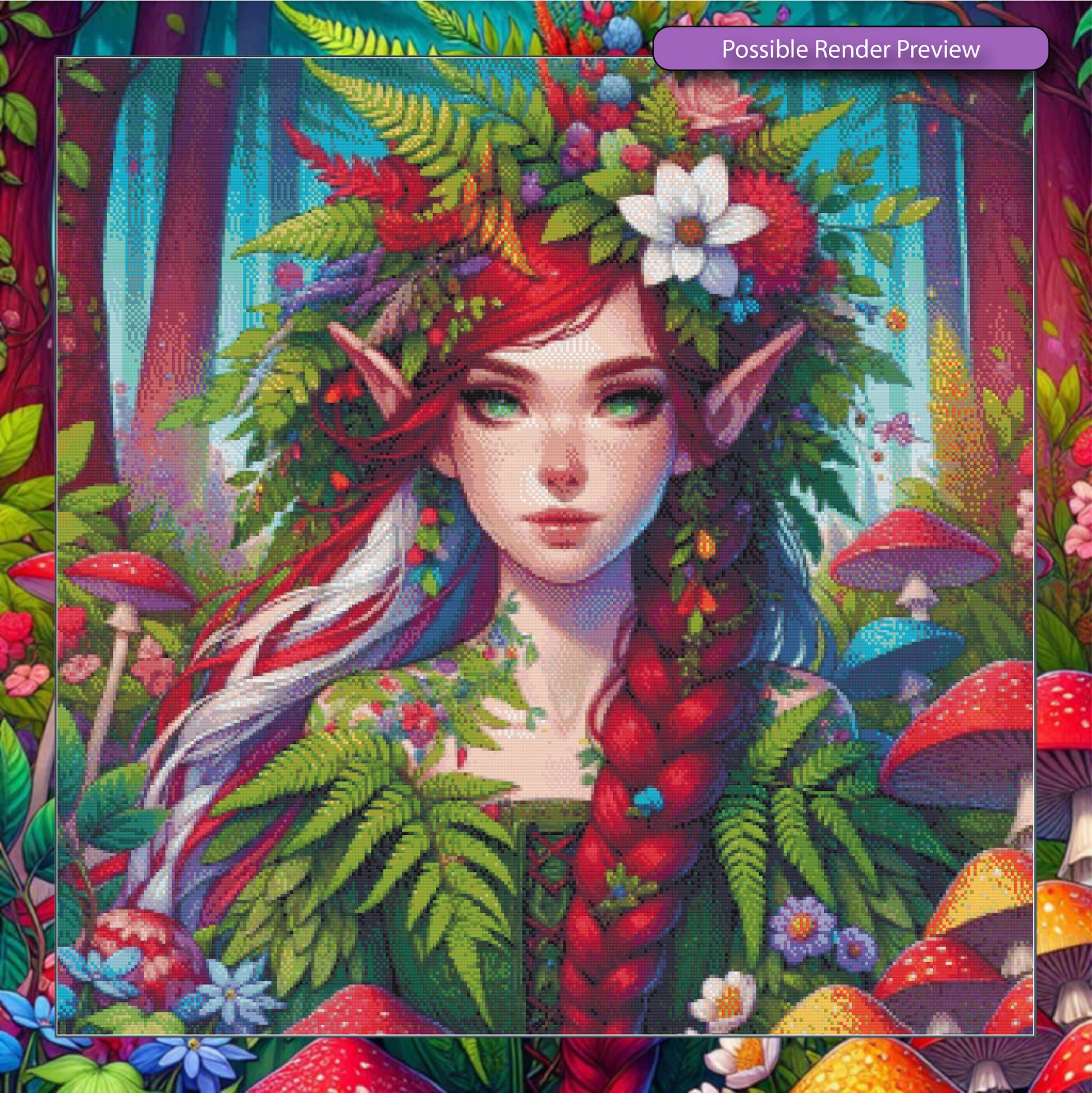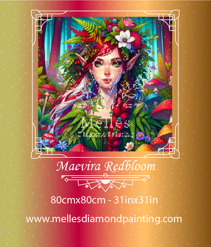 Draped in the forest’s breath, Maevira walks with the grace of dew and the fire of autumn leaves. Her crimson braid twines like rooted fate, her crown a wild bloom of every woodland secret. She is both healer and sentinel, born of fern and flame.