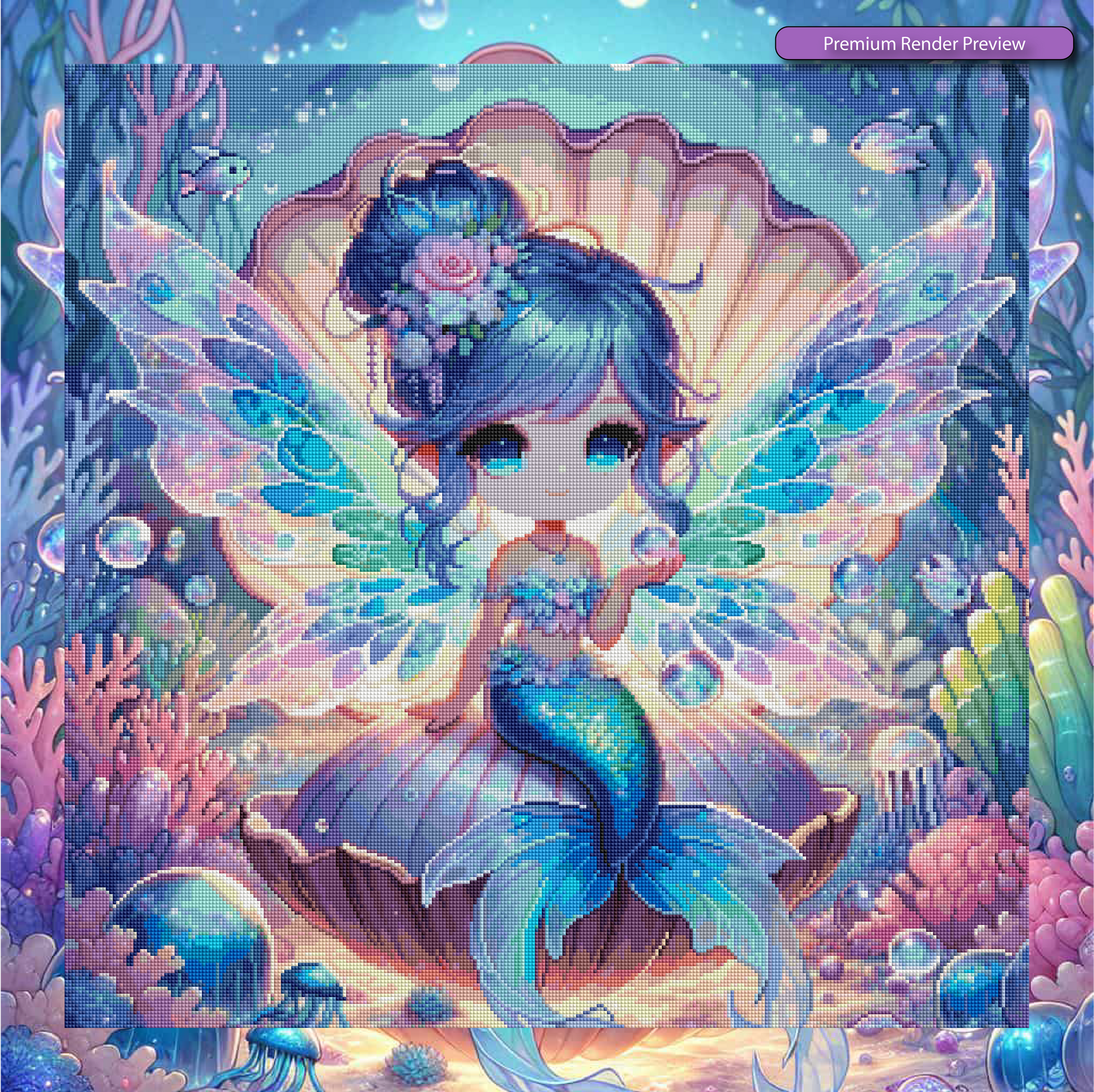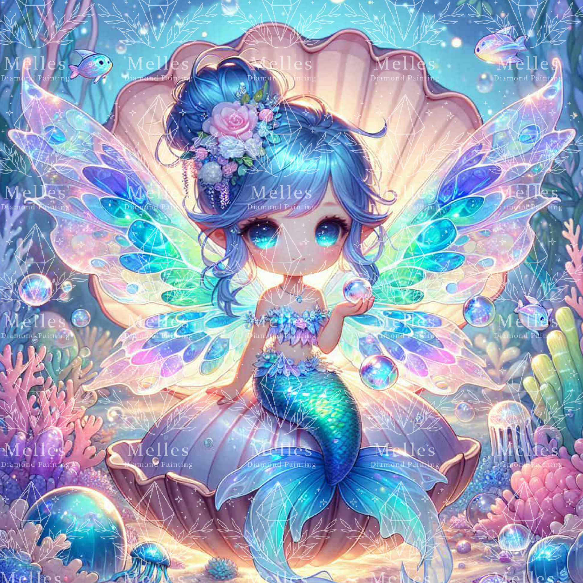 Cradled within her seashell throne, she weaves bubbles of magic — each one holding a wish, a memory, or a secret from the sea’s heart. The fish that circle her glow not from the sun above, but from the magic she releases below.