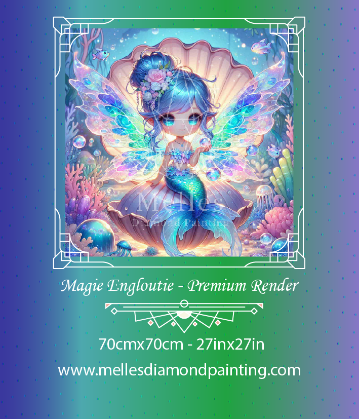 Beneath the shimmering waves, where sunlight turns to song and pearls hum with forgotten dreams, dwells Magie Engloutie — the enchantress of the deep. Her wings glimmer with the hues of ocean dawns, and her laughter ripples through coral gardens like a melody of light.