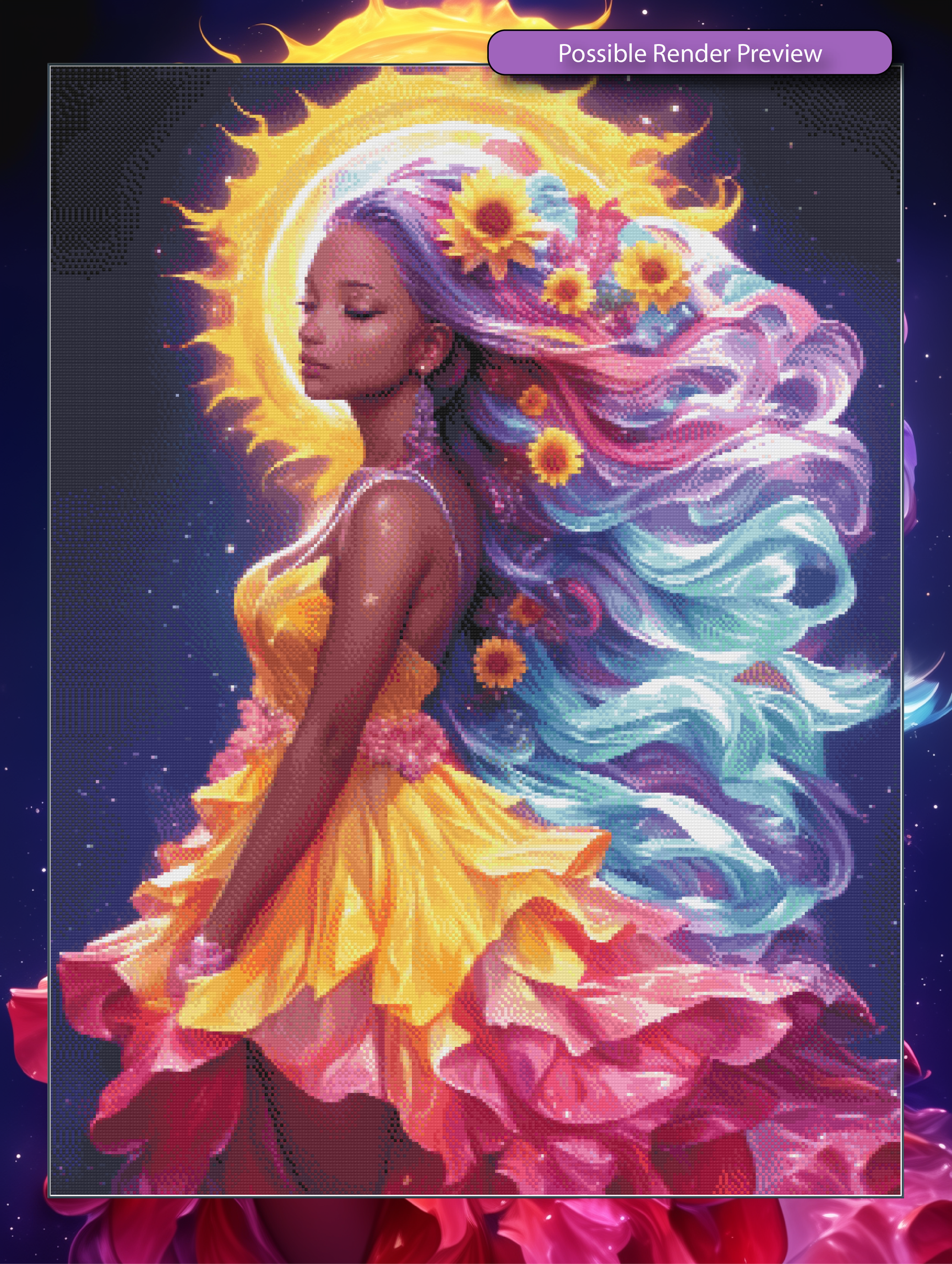 Bathed in sunlight, Makaila stands in calm grace as her radiant hair flows like seasons in motion. Flowers bloom where light touches her, and the universe seems to pause just to breathe with her. 🌈✨