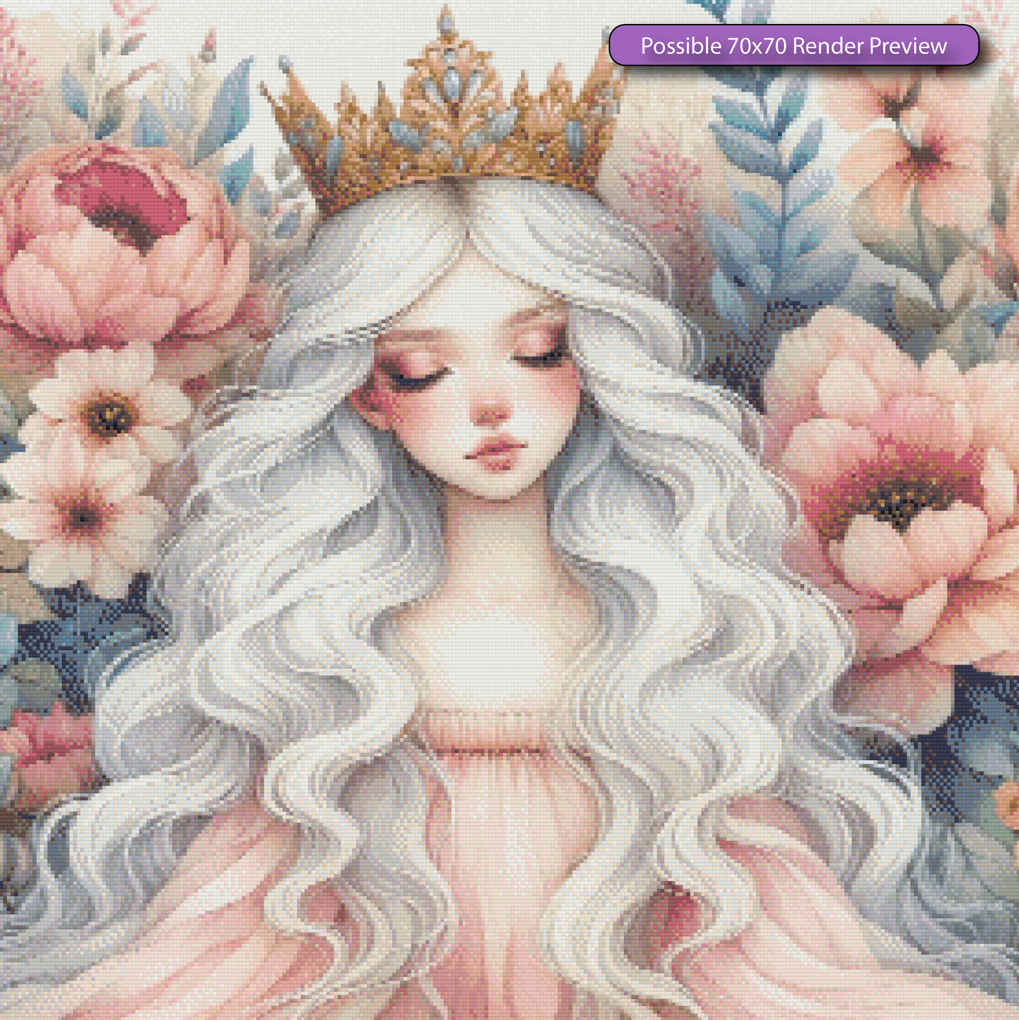 Step into a world of grace and elegance with **"Princess Michelle,"** the latest enchanting addition to the **Princesses Collection.** With her flowing silver hair and serene expression, this regal princess embodies both beauty and poise, surrounded by soft blooms that accentuate her ethereal presence.