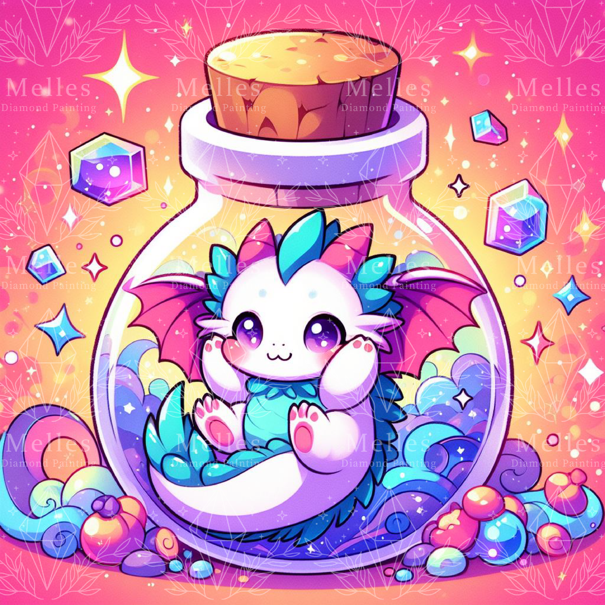 A tiny dragon curled up in a shimmering potion bottle — brewed with bursts of courage, sparkly giggles, and a dash of rainbow flames! With gem-like scales, cotton candy wings, and a glowing swirl of magical clouds, this little cutie radiates joy and wonder. Perfect for powering up hearts and dreams! ✨💜🔥