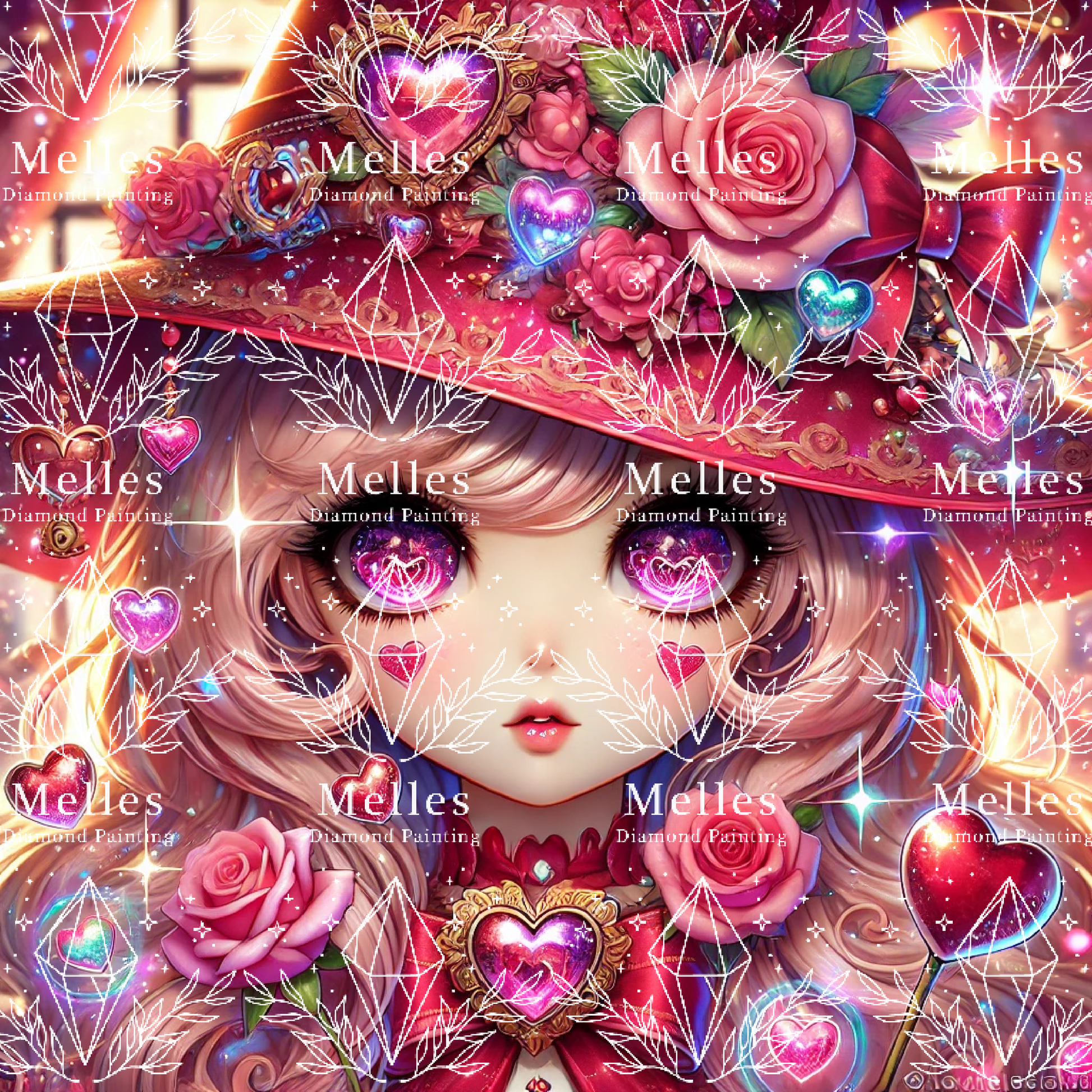 "Miss Valentina" 🌹💖 embodies the essence of romance, magic, and whimsy. Adorned in a stunning crimson ensemble, her wide-brimmed hat bursts with blooming roses 🌺, delicate bows 🎀, and sparkling heart jewels 💎. Her mesmerizing eyes shimmer like galaxies of love 🌌✨, reflecting radiant pink and purple hues that dance with magic. Swirling golden curls cascade like flowing silk 🪄, framing her doll-like face with elegance. Around her, floating hearts ❤️ and twinkling lights ✨ create an aura of enchantment as she holds a single rose 🌹, a token of timeless beauty and affection.