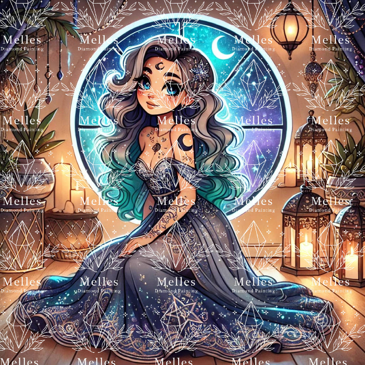 Adorned with moonlit tattoos and mystical markings, she is a true embodiment of lunar magic. Draped in a deep sapphire gown woven with constellations and ancient symbols, she exudes an aura of ethereal grace.