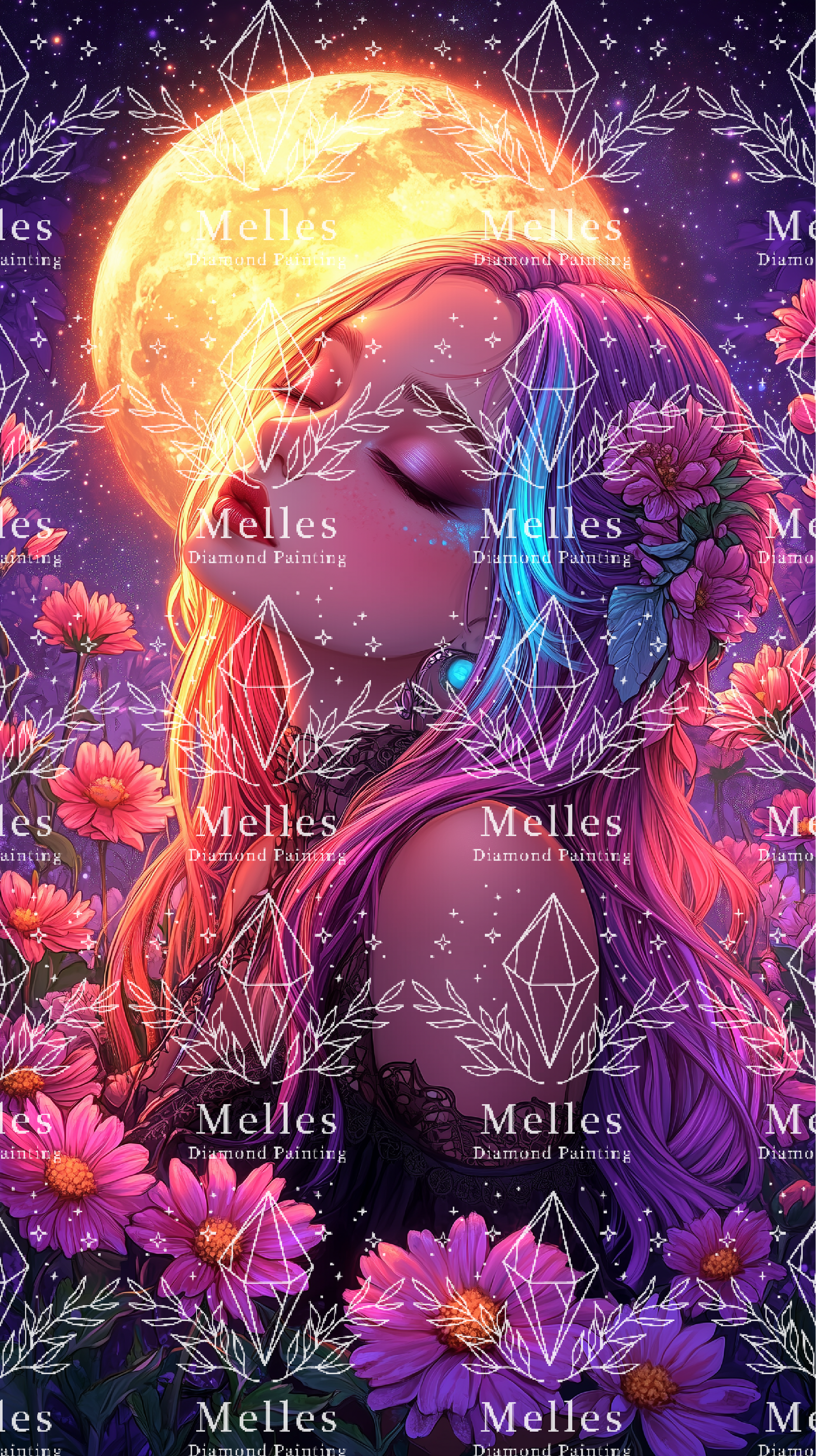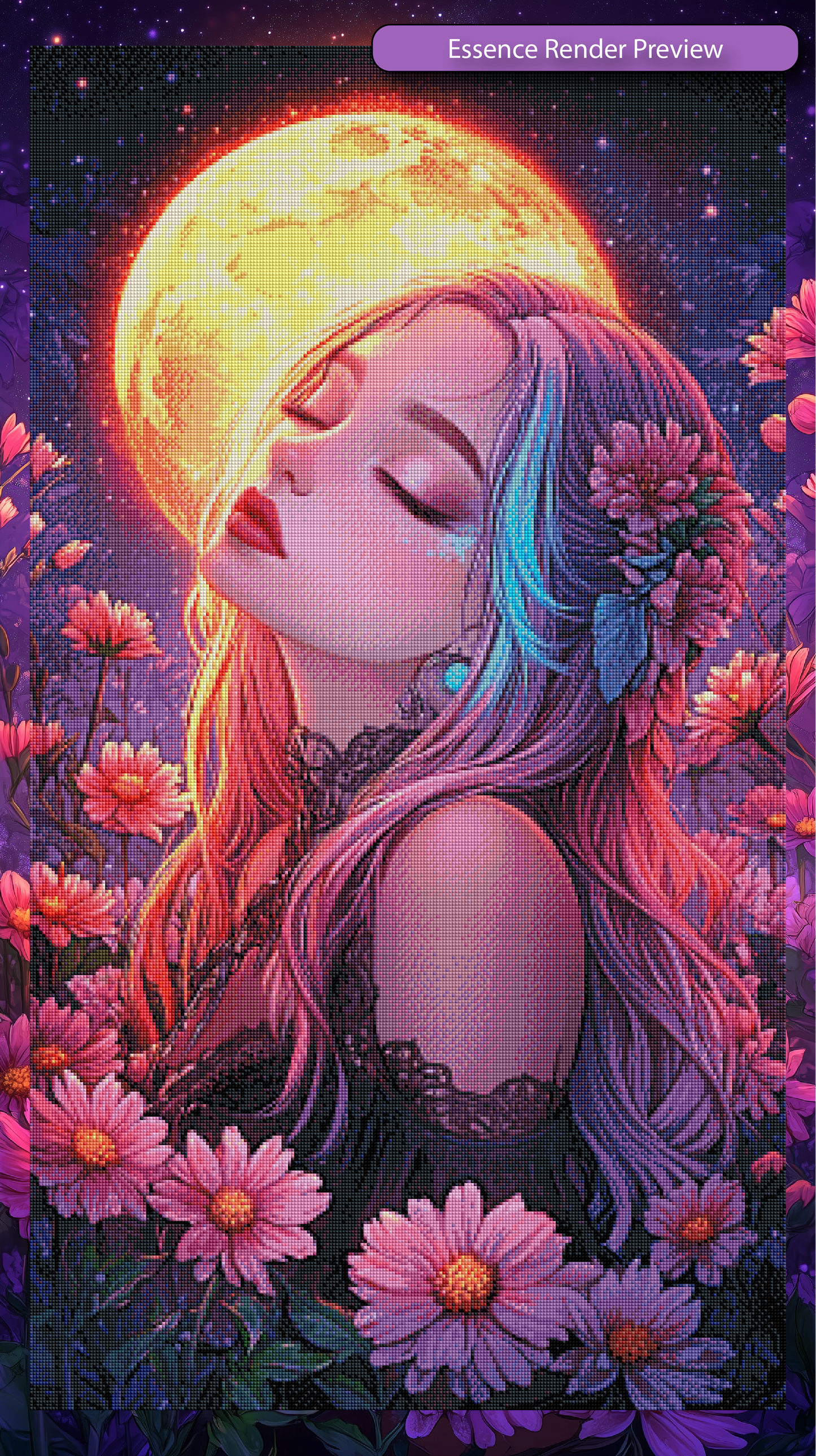 Bathed in stardust and moonfire, she tilts her face to the heavens, eyes closed in a moment of radiant surrender. Her twilight hair glows with cosmic hues, blooming with wildflowers and secrets. Surrounded by blushing petals and wrapped in midnight lace, she is both a whisper and a wish — a soul caught between dreams and the pull of the moon.