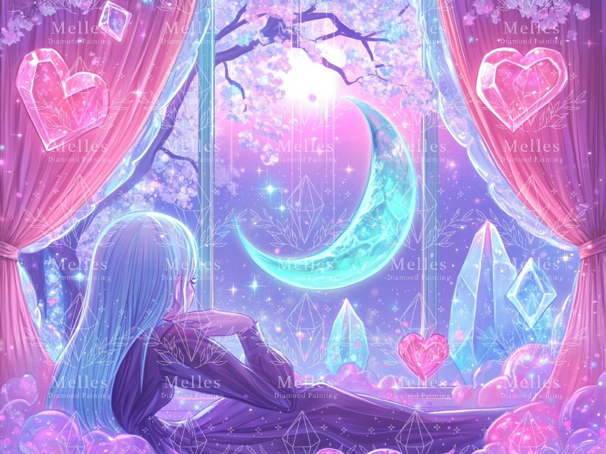 Bathed in soft twilight, a girl gazes out into a world of moonlit dreams and floating crystal hearts. Wrapped in velvety shadows and glowing petals, she listens to the hush of the universe through an open window of wonder. The crescent moon glows gently among sparkling stars and blooming sakura, as if whispering secrets only the heart can hear. 💖🌸🔮