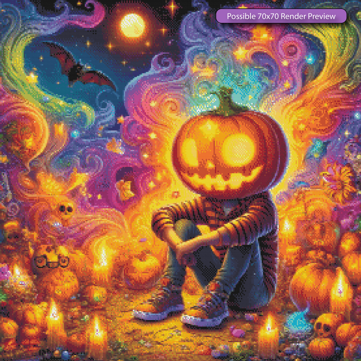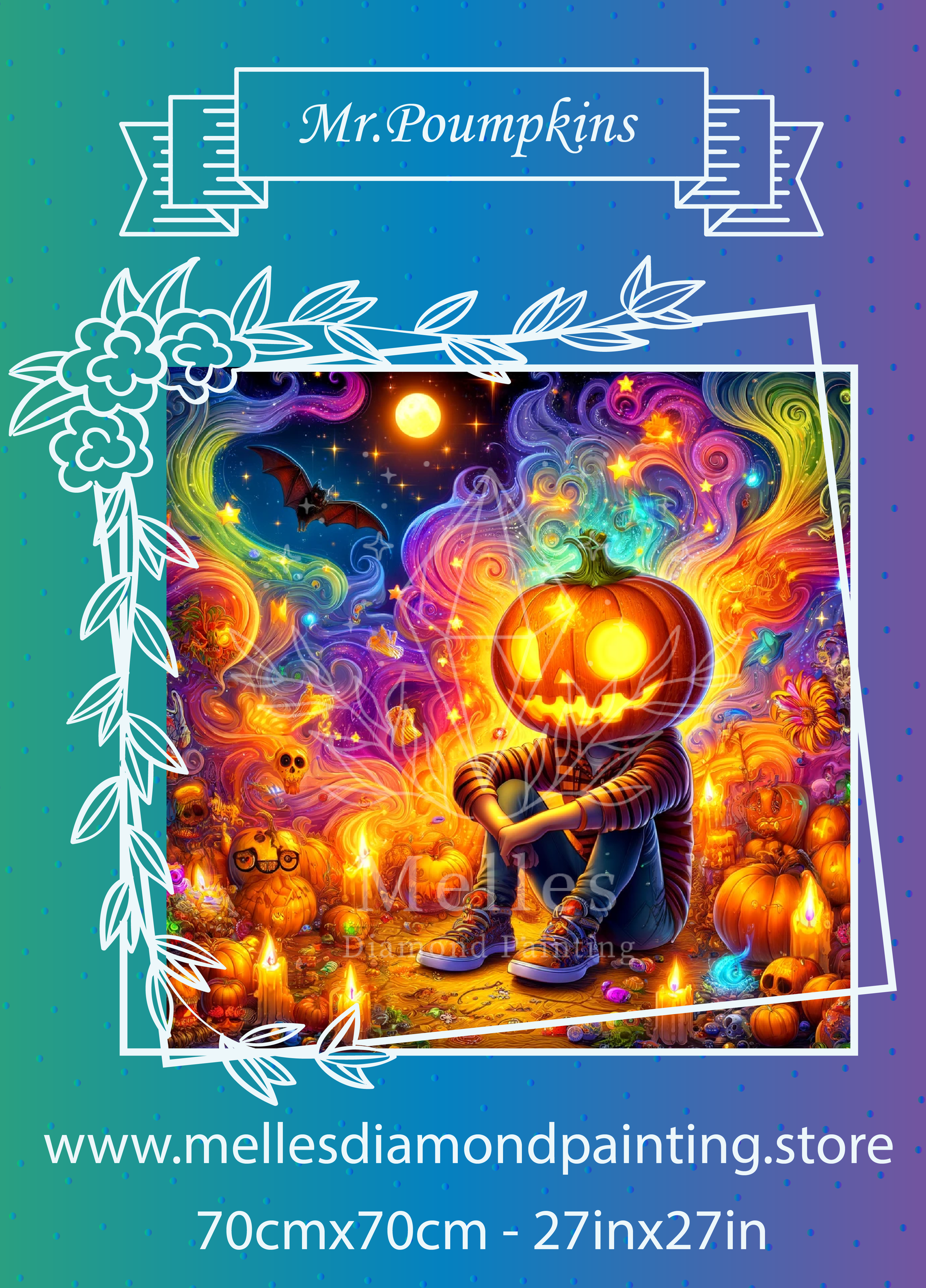 Step into a world of glowing pumpkins, flickering candles 🕯️, and swirling Halloween magic 🌙. Mr. Poumpkins sits under the full moon, his jack-o’-lantern head shining brightly, lighting up the night with his mischievous grin. 🧡✨ Surrounded by whimsical spirits, flying bats 🦇, and enchanted pumpkins, his presence is both eerie and delightful.