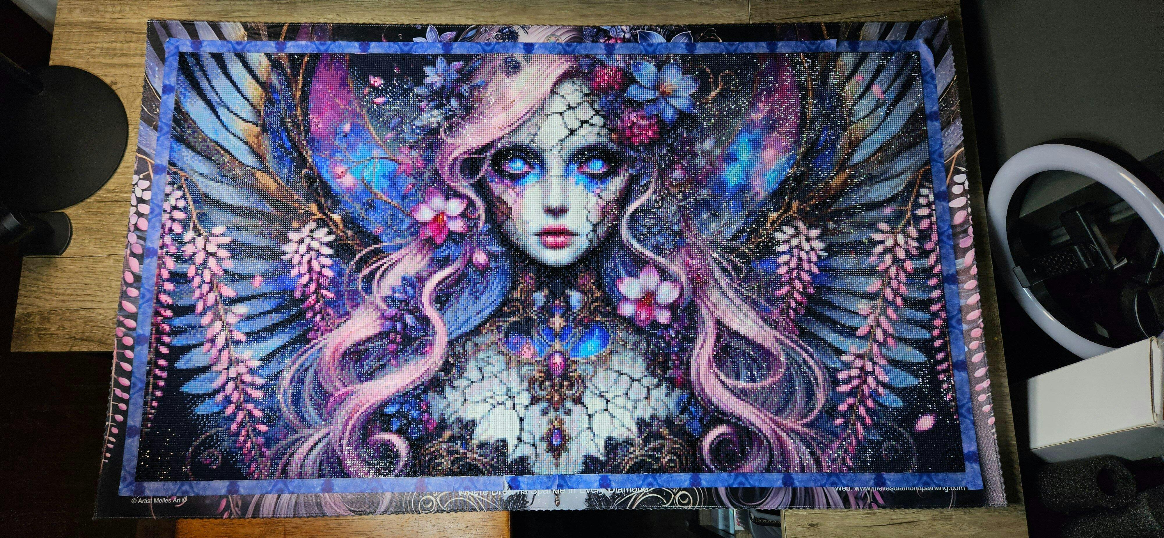 An ethereal embodiment of mystery and celestial sorrow. 🌙🖤 Her porcelain form, fractured yet resilient, unveils a cosmos within—a goddess of the night woven from shattered stardust and blooming twilight. With her wings laced in cosmic dust and cascading petals, she is the whisper of the unseen realm, where dreams and oblivion intertwine. 🌌🌺