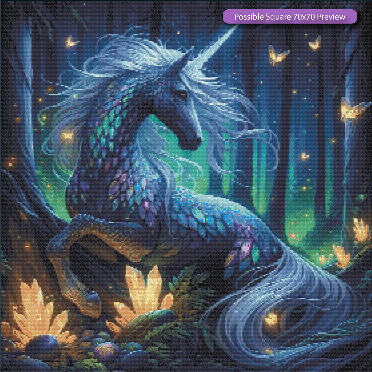 The deep, twilight hues of the forest create a serene and magical backdrop, perfectly framing the unicorn as the embodiment of the ocean's soul.