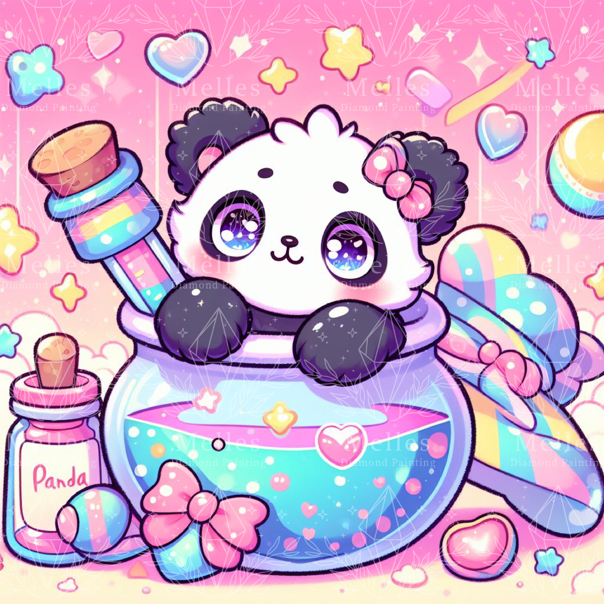 Bouncing with bubbly joy and sugar-sweet sparkle, this precious panda peeks out of a candy-colored potion jar! Surrounded by hearts, stars, and rainbow lollies, she's the potion of pure happiness — brewed with cuddles, charm, and pastel magic. Her sparkling eyes and little bows are enough to melt anyone’s heart. 🍬🌈💗