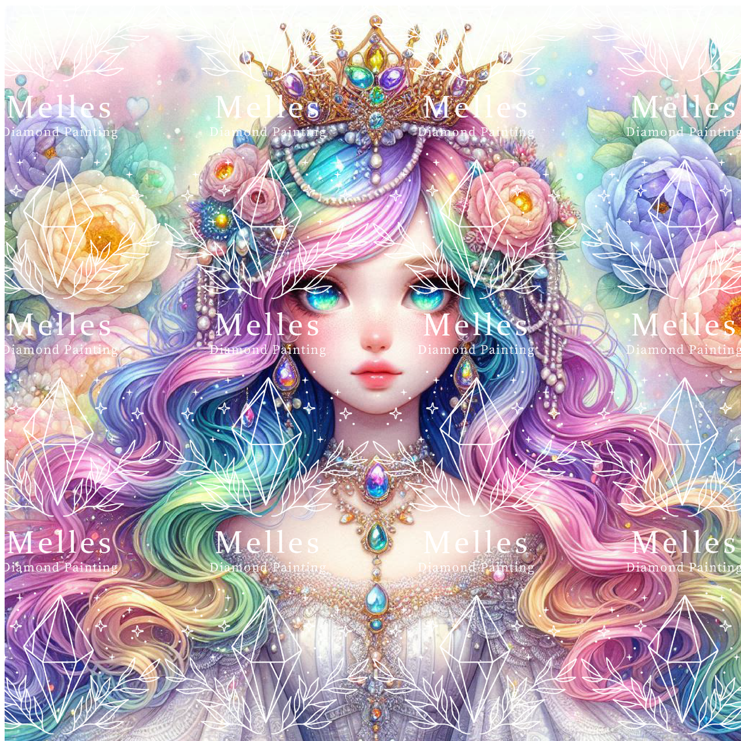 Step into a whimsical world with Princess Katalaya, a vision of elegance and enchantment. With her radiant rainbow locks and jeweled crown, she reigns as a symbol of beauty and grace. Surrounded by pastel blooms, her mesmerizing gaze invites you into a realm where dreams flourish and creativity knows no bounds. 🌸🌈