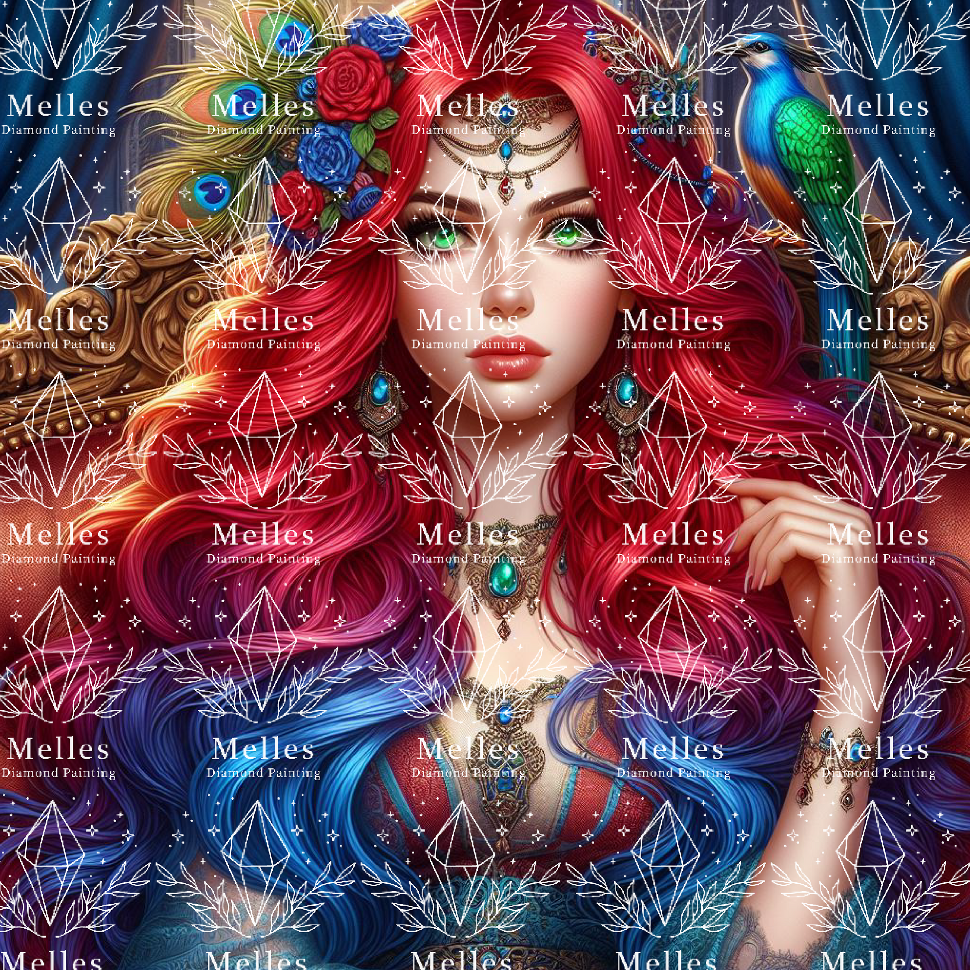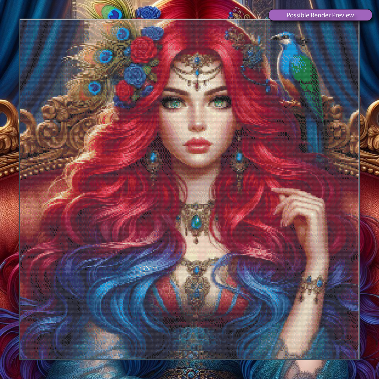 A majestic peacock feather crown and a sapphire-plumed bird perched beside her symbolize beauty, nobility, and mystery. Seated upon her ornate throne, she is the ruler of twilight, commanding both the stars and the whispers of the night. 🔮🦚💎