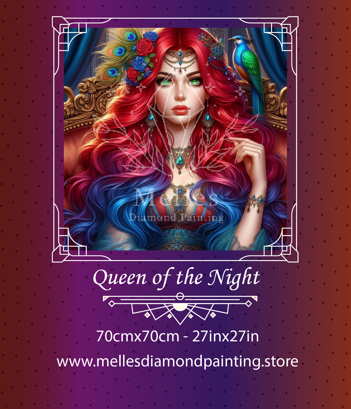 A vision of regal elegance and mystique, the Queen of the Night reigns with an aura of power and allure. Her cascading crimson and sapphire hair flows like a celestial river, framing piercing emerald eyes that hold the wisdom of ages.