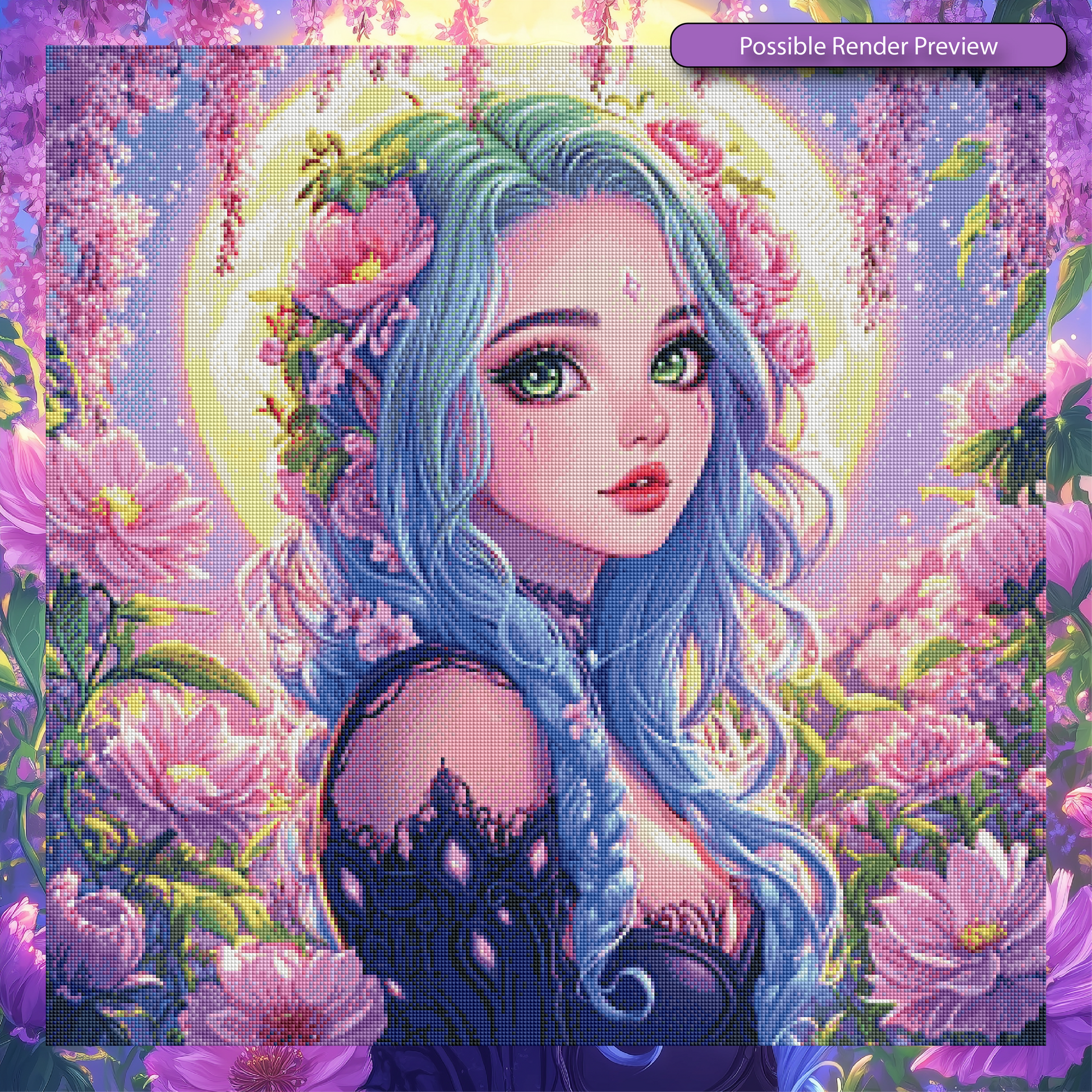 Bathed in moonlight, Queena radiates ethereal beauty with her emerald eyes, flowing blue hair adorned in blossoms, and a gown that glimmers like stardust. 🌺💫